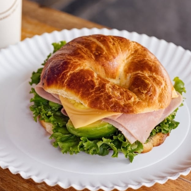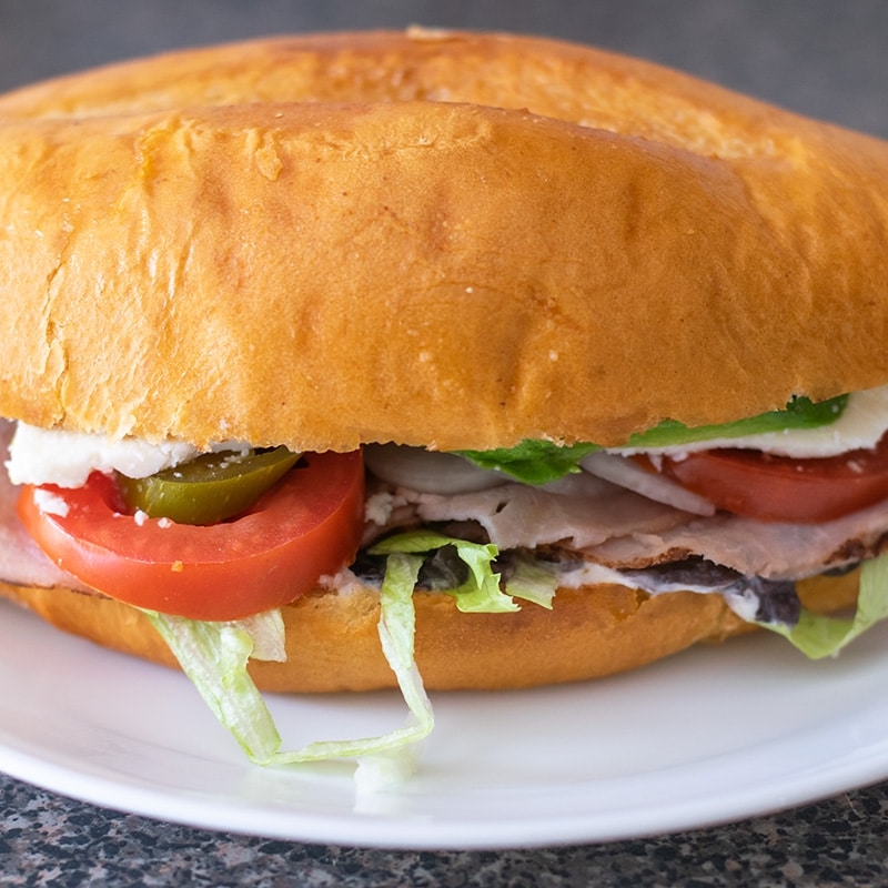 Cuernito con jamón mayonesa queso amarillo y panela lechuga jitomate aguacate y chiles en vinagre