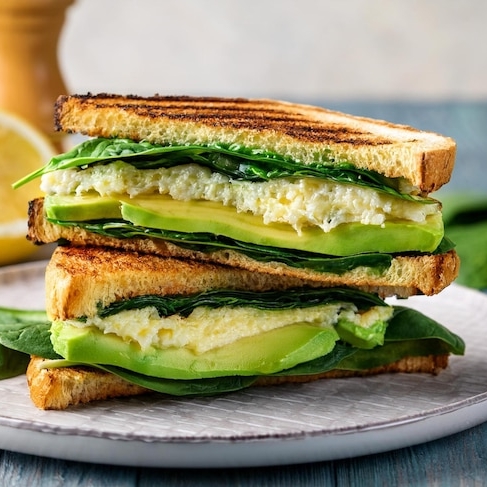 Pan Cero Cero Bimbo con una base de Espinaca y una de aguacate y un omelet (huevo en torta)