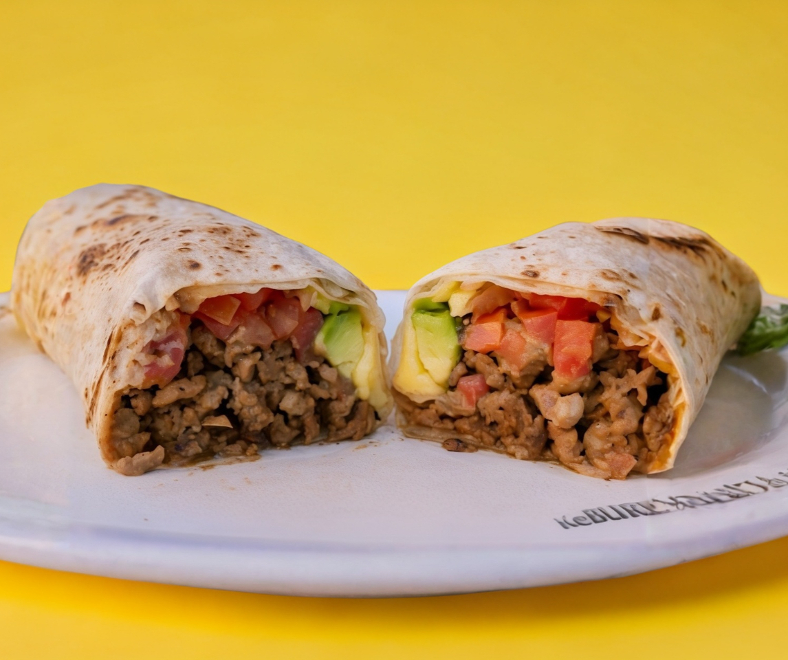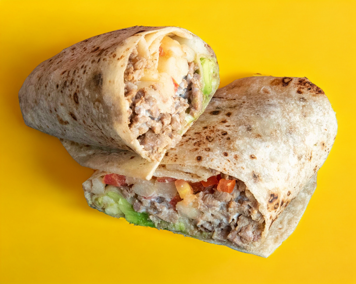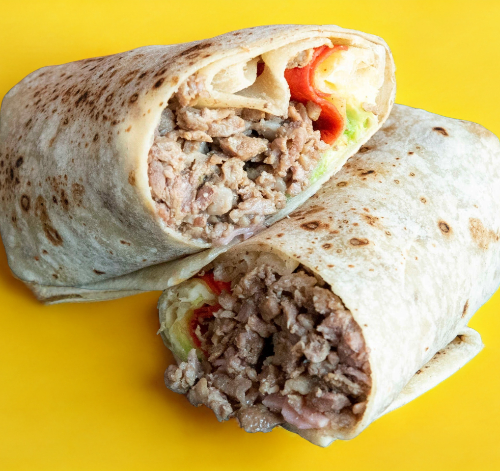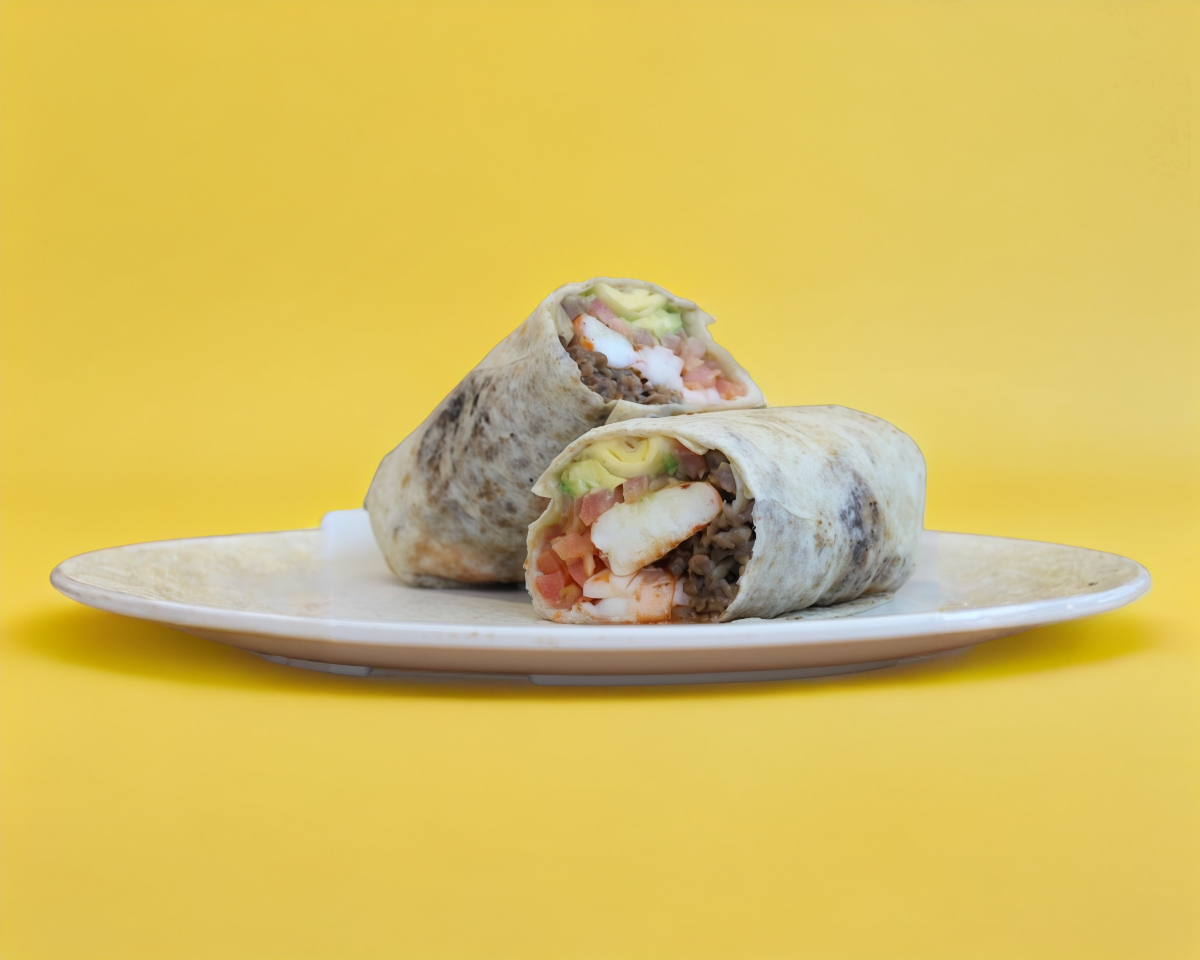 Tortilla de harina sobaquera con Carne de res (diezmillo), camarón sazonado, queso asadero, chile verde (chilaca), aguacate y tomate.