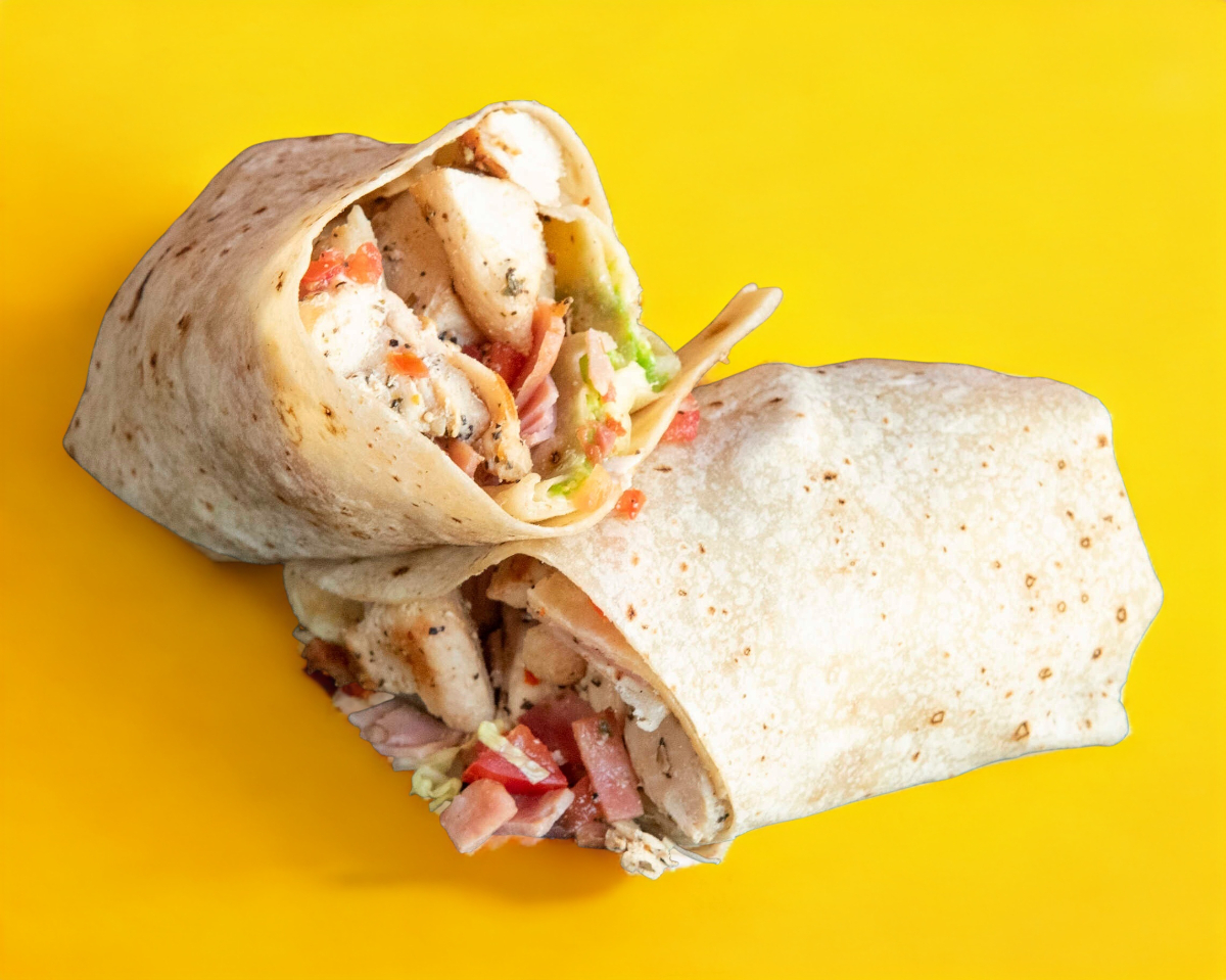 Tortilla de harina sobaquera con Pechuga de pollo sazonado a la plancha, jamón, tocino, queso, tomate y aguacate.
