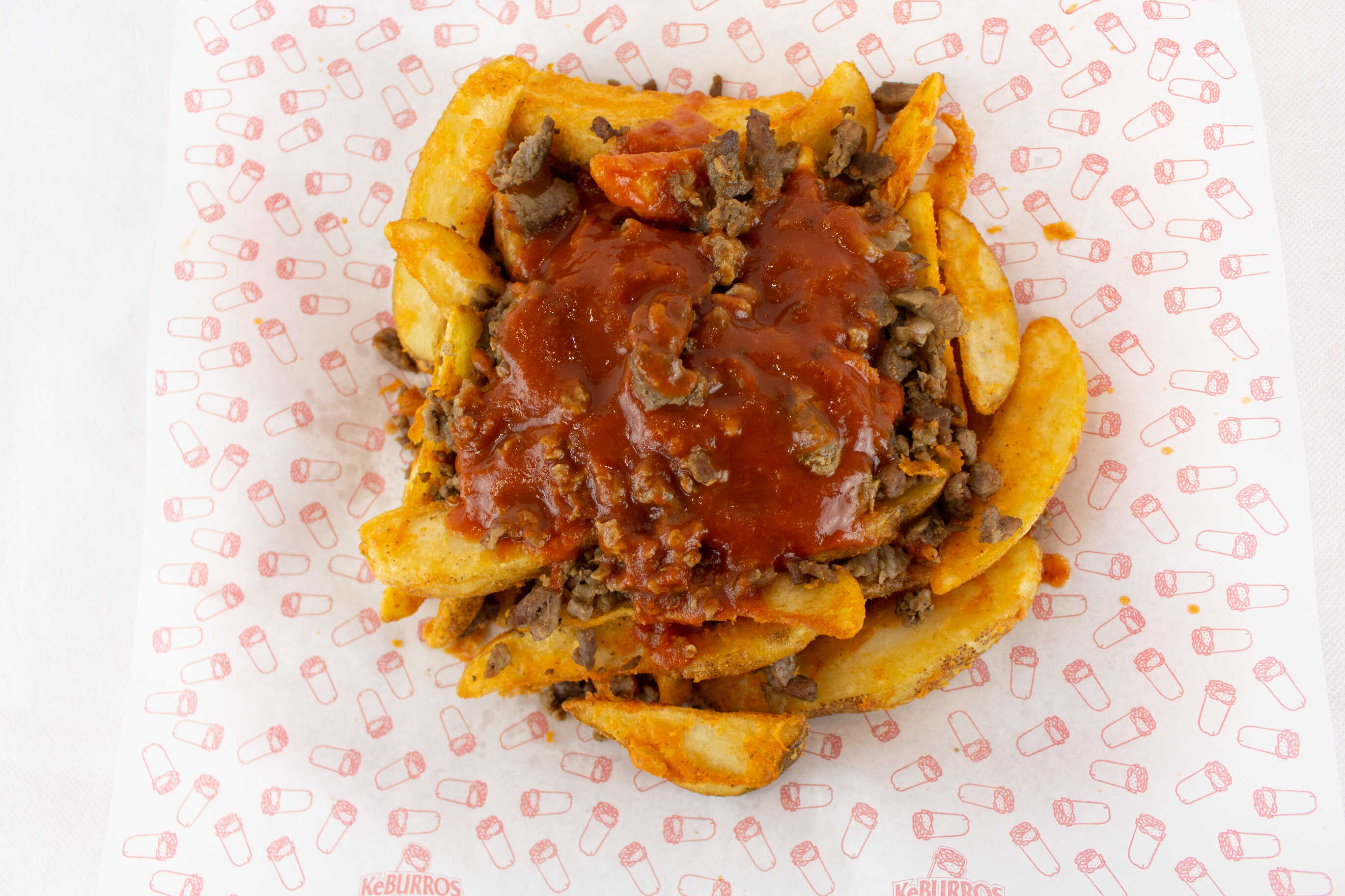 300 g. de papas a la francesa, 130 g. de carne a la plancha, queso amarillo y aderezo ranch.