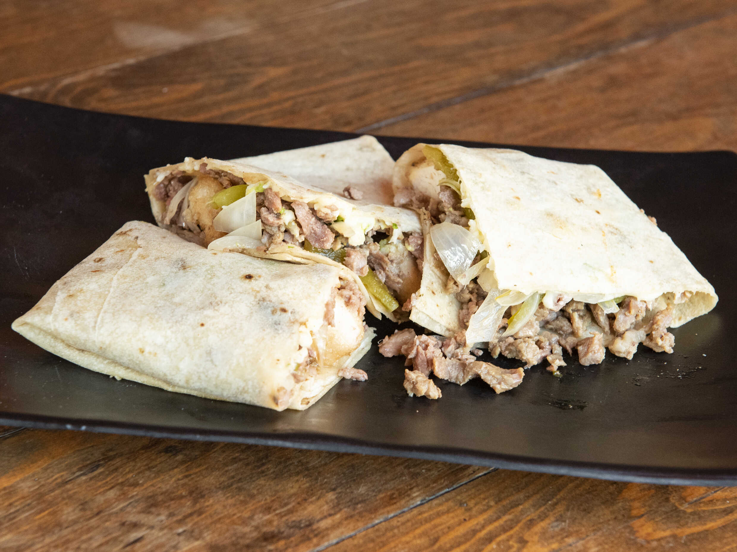 Tortilla de harina sobaquera con Carne de res (diezmillo), extra queso, tomate, aguacate y tiras de chile verde (chilaca)..