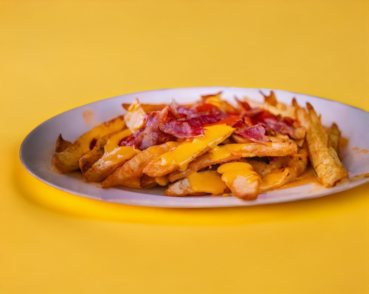 250 g. de papas a la francesa, queso amarillo, tocino y ahogo.