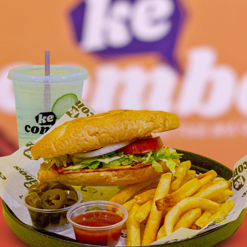 Torta de jamón lechuga, jitomate, cebolla, mostaza, aguacate, 150grs de papas a la francesa bebida 1/2 litro