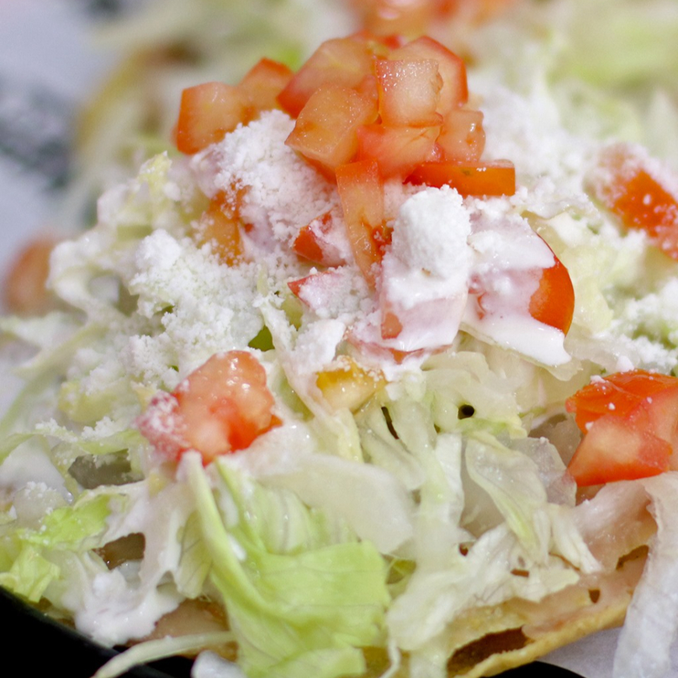 frijoles, cueritos, lechuga, jitomate, crema, queso