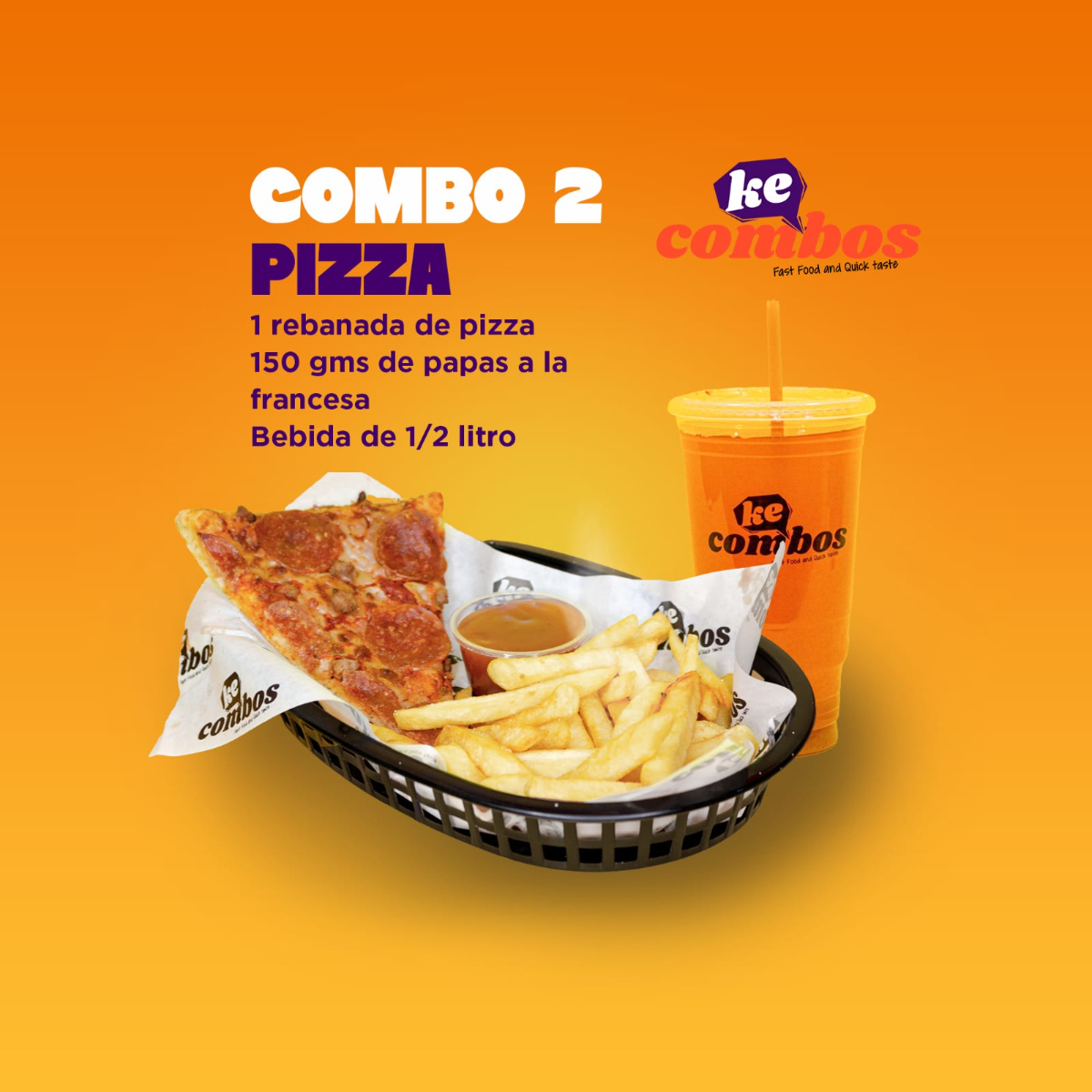 1 rebanada de pizza, 150grs de papas a la francesa, bebida 1/2 litro