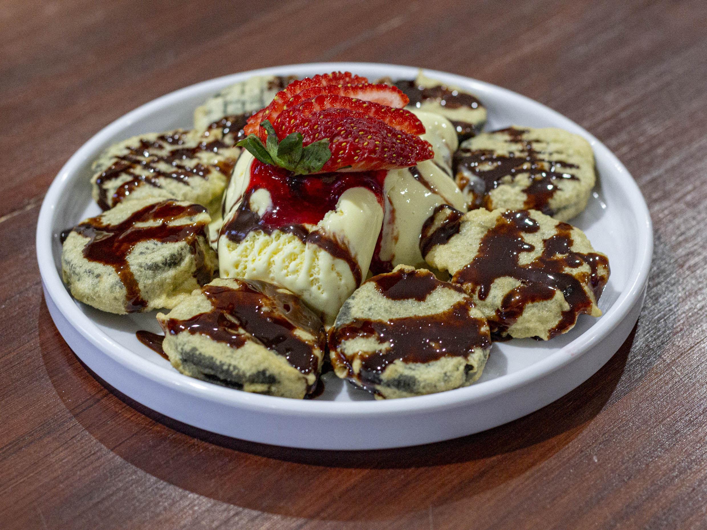 Galletas oreo tempurizadas acompañadas con helado y chocolate o cajeta