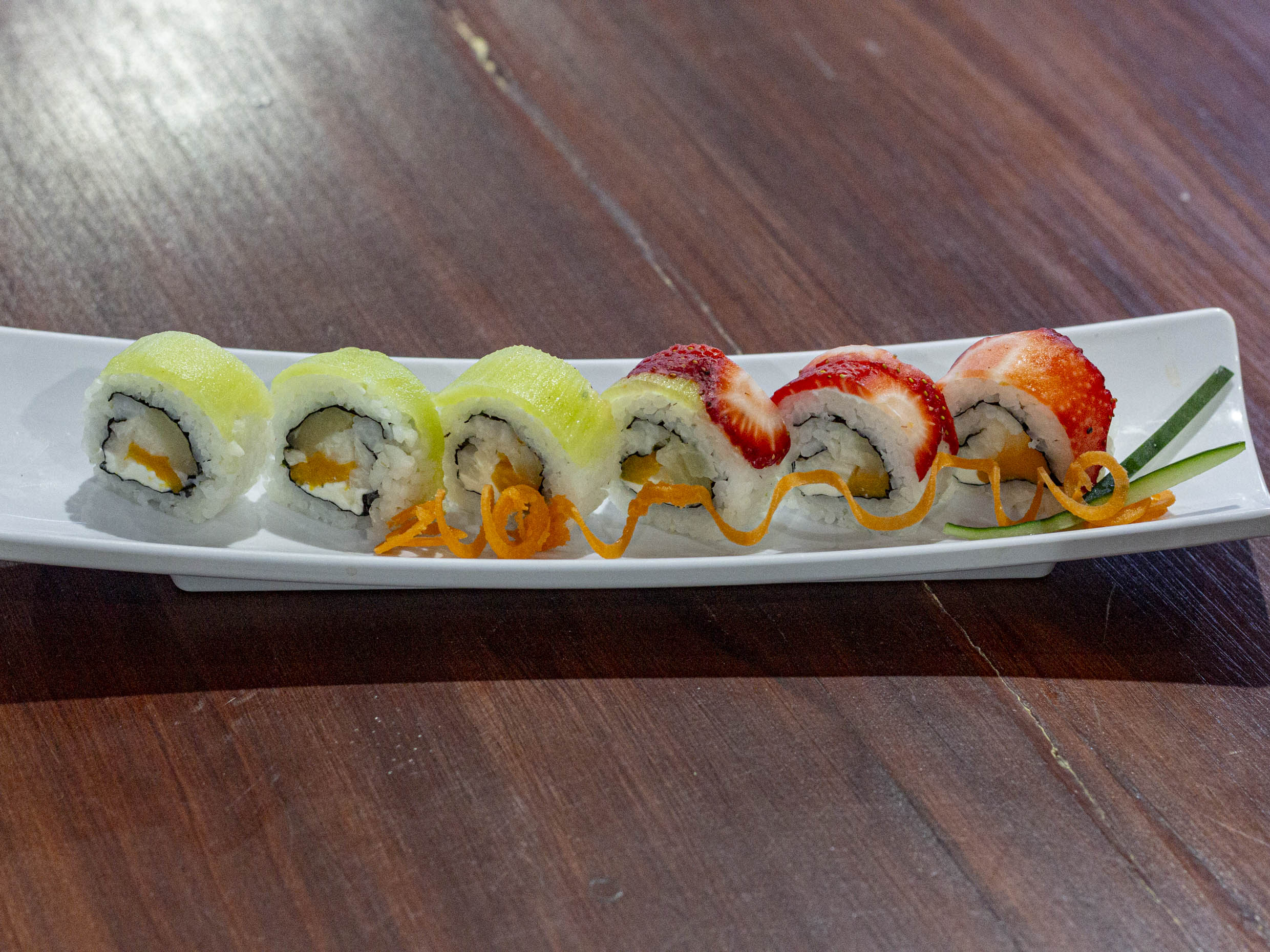 PF: arroz blanco, queso crema, fresa y kiwi. PD: alga, piña,durazno, queso crema y jícama.