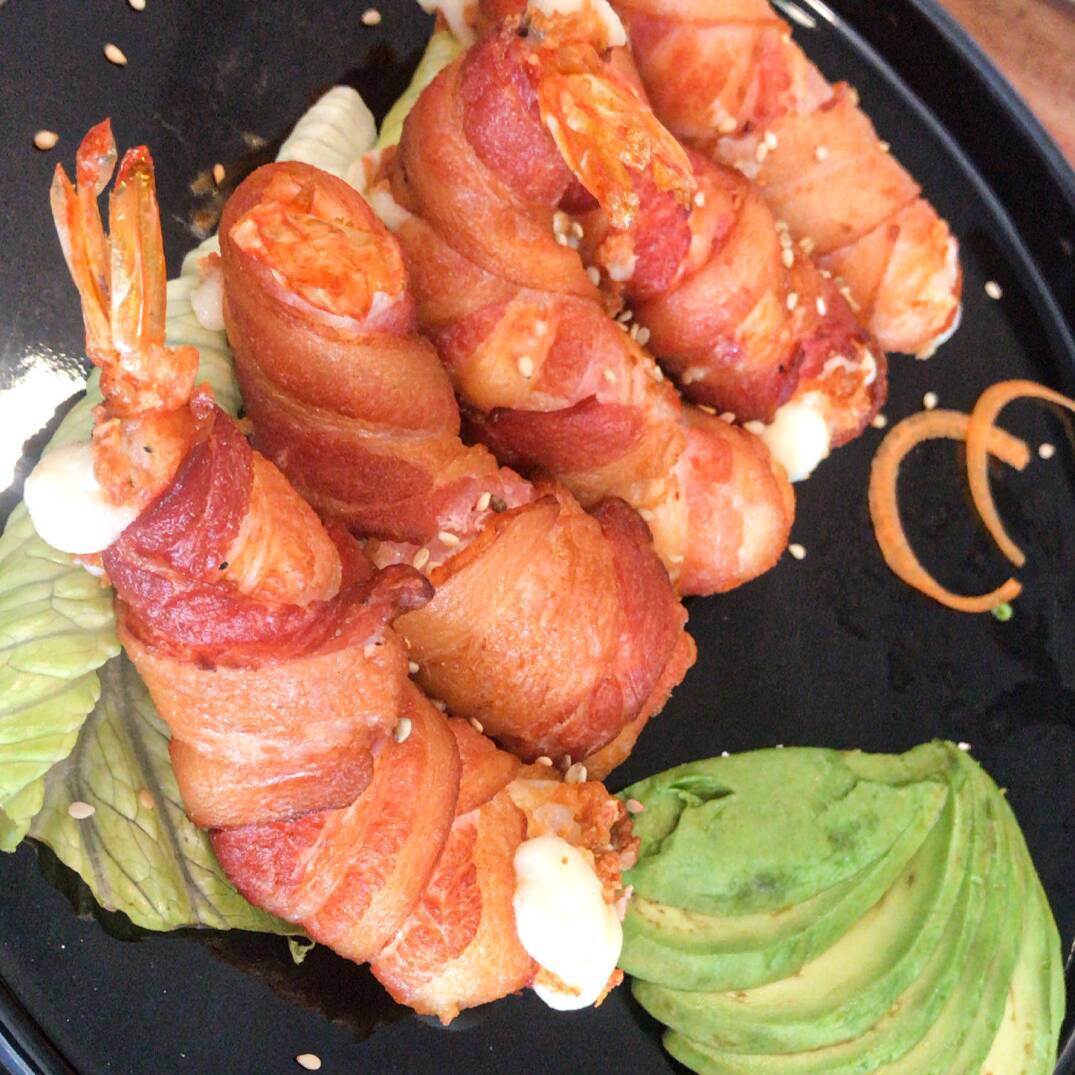 Camarones empanizados bañados en una salsa especial Roka, servidos en hoja de arroz frito y lechuga.