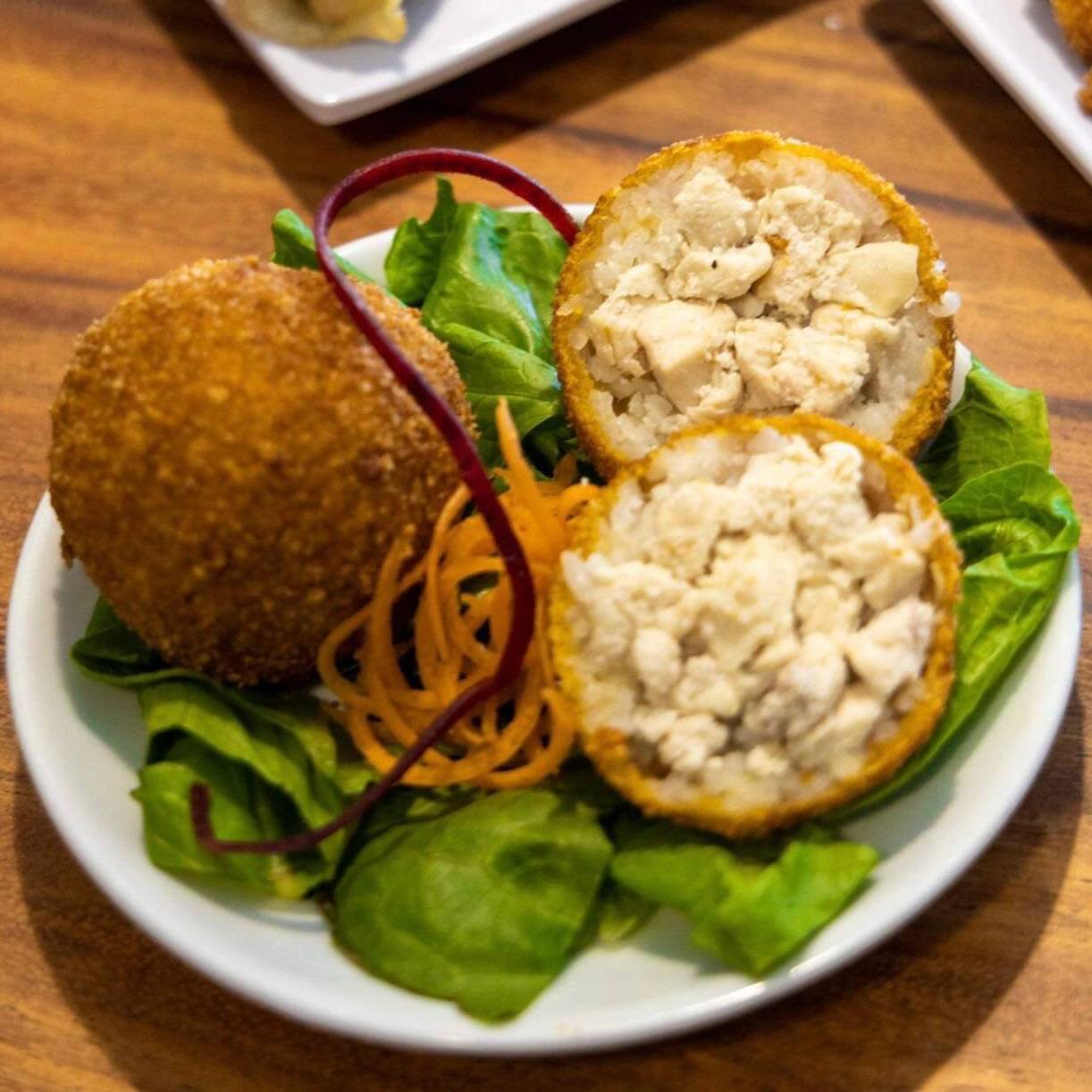 Bolitas de arroz empanizadas, rellenas de res o pollo, acompañadas de aderezo agridulce ( 4 piezas)