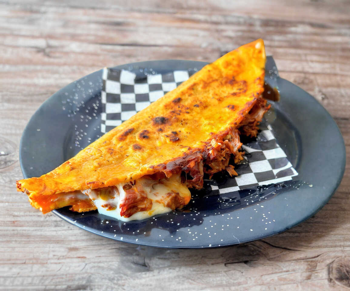 tortilla hecha la momento 26 cm aprox bañada en grasa de la birria rellena de la misma, queso manchego y una contra de queso