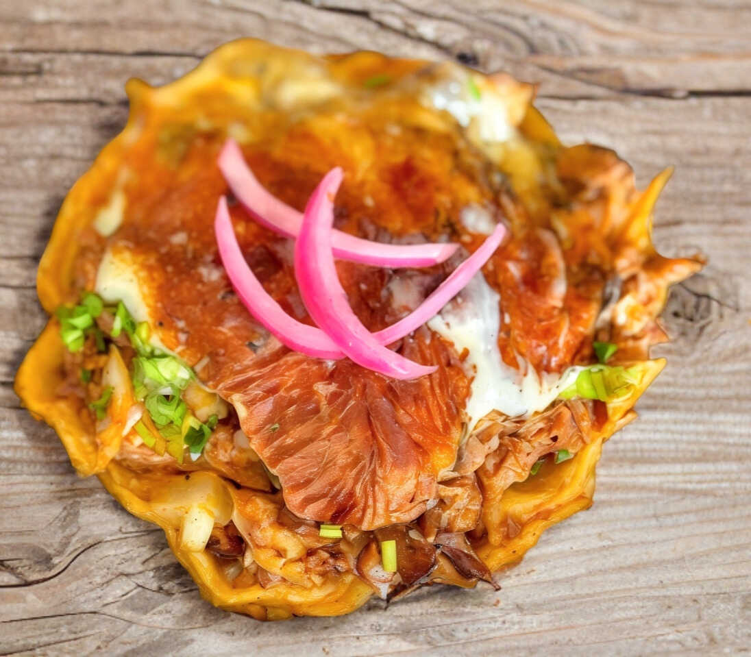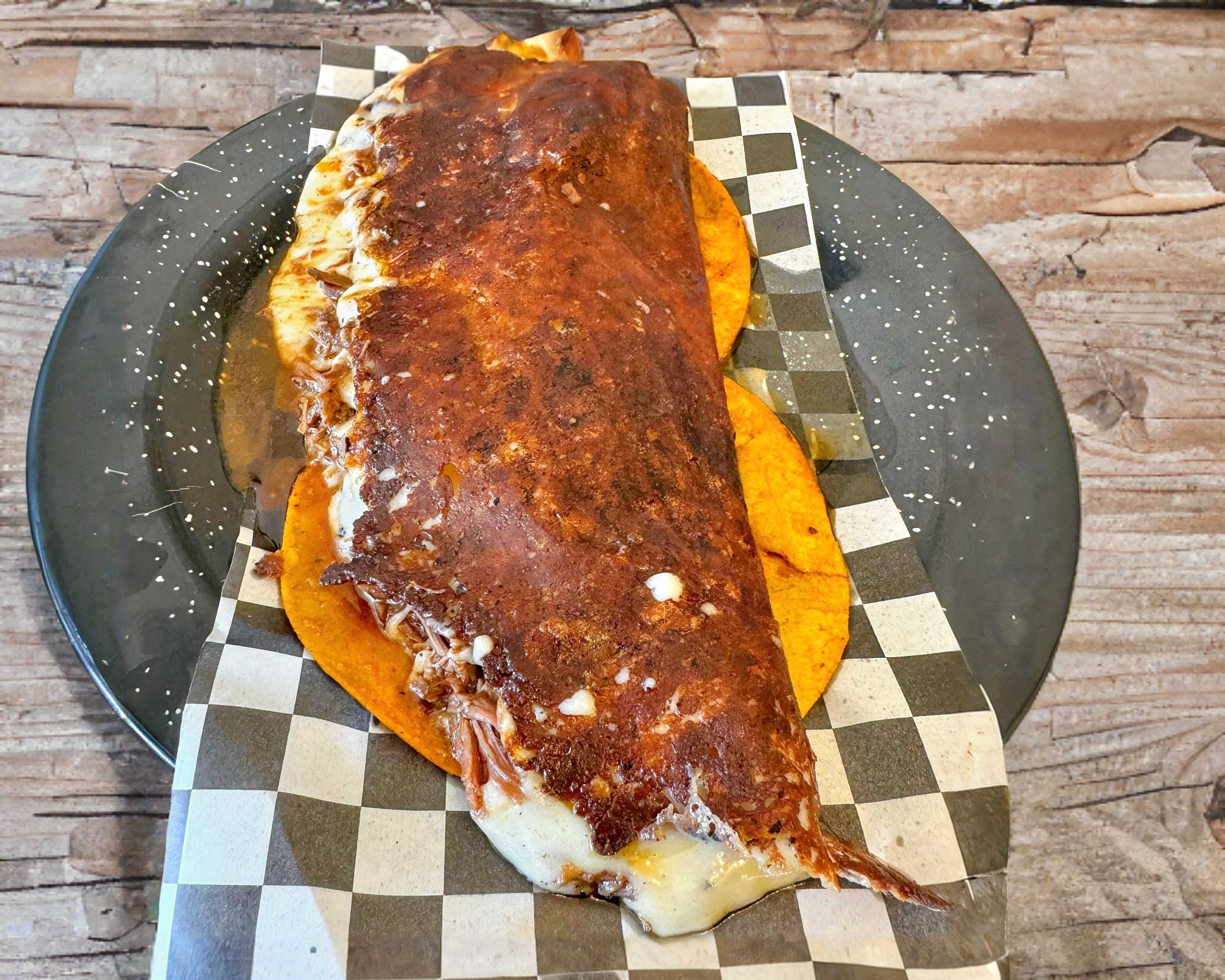 tortilla de harina de 26 cm bañada en grasa de la birria, rellena de la misma y queso asadero