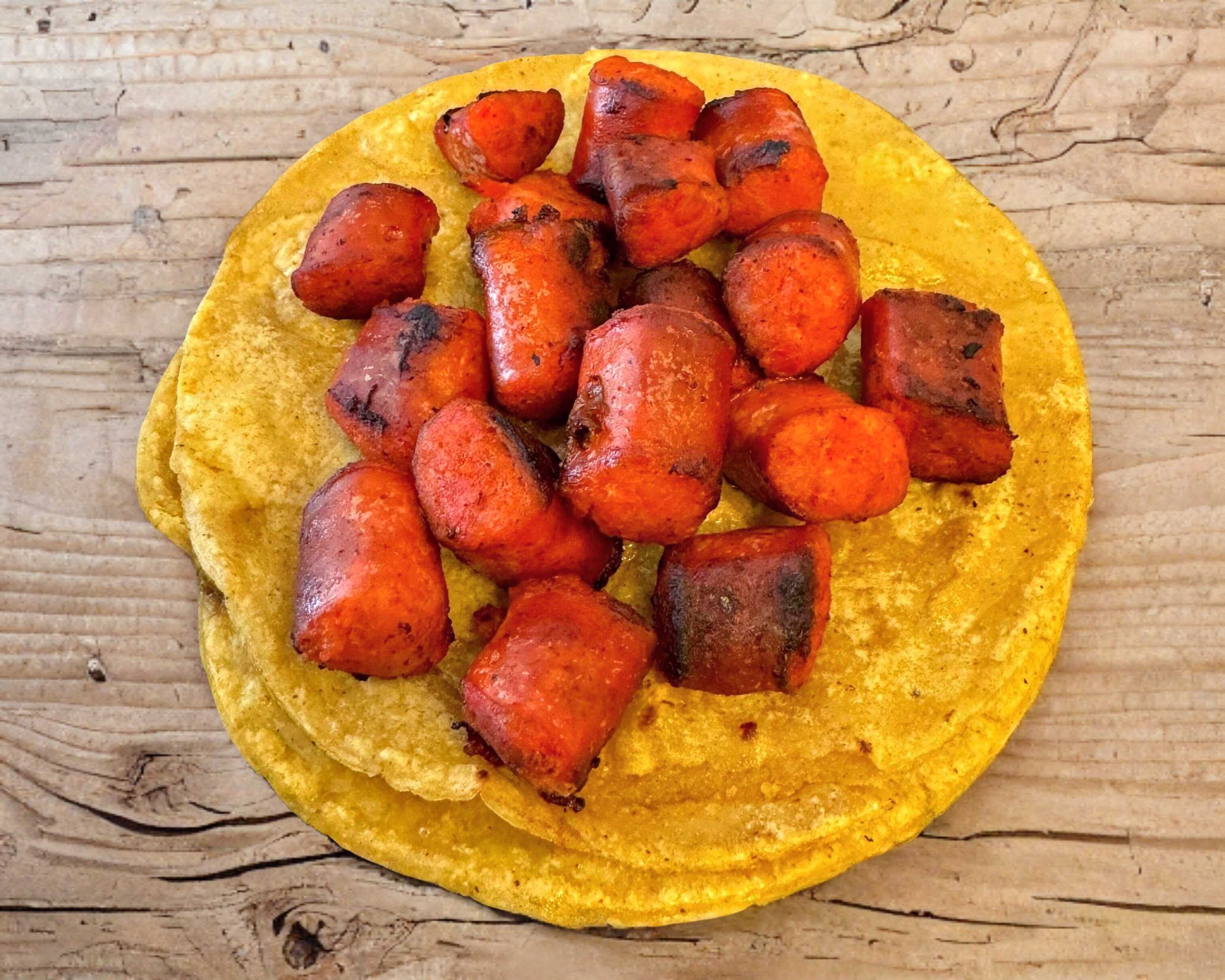 Doble tortilla de maíz bañada en grasa de la misma birria y rellenos de la misma