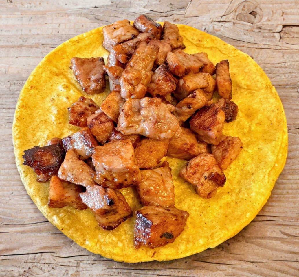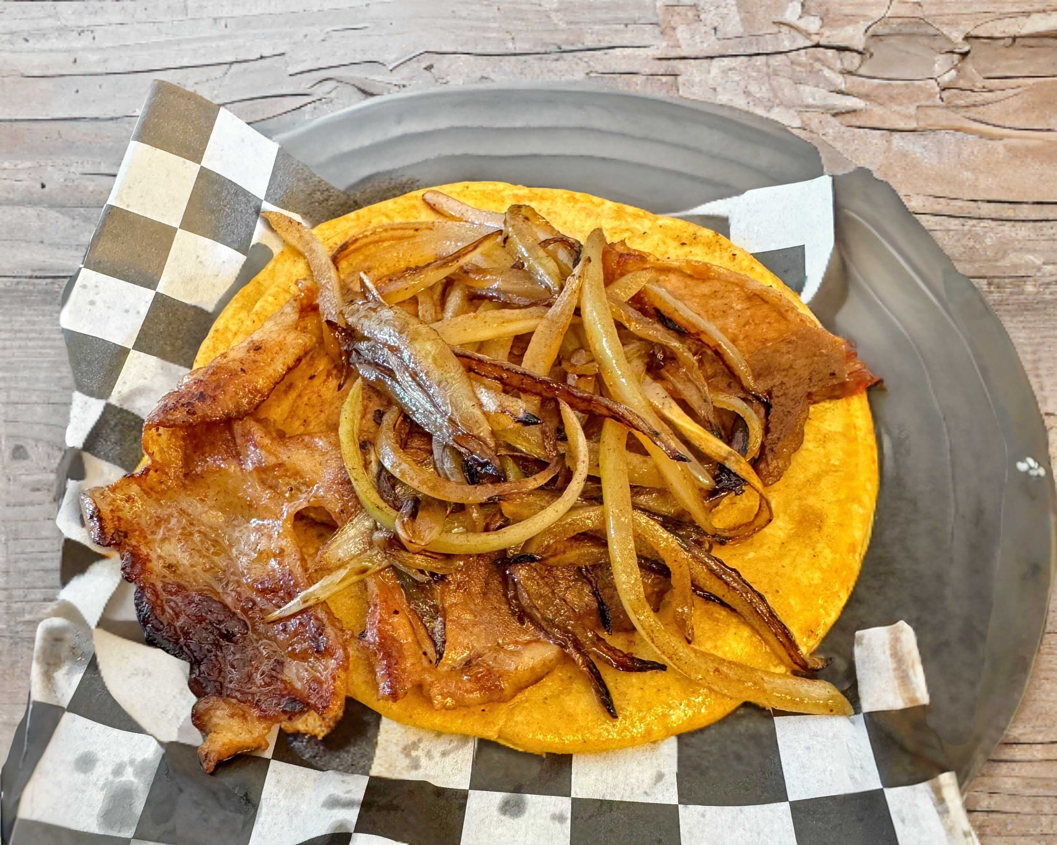 tortilla de maíz rellana de un delicioso trozo de bistec y cebollita azada