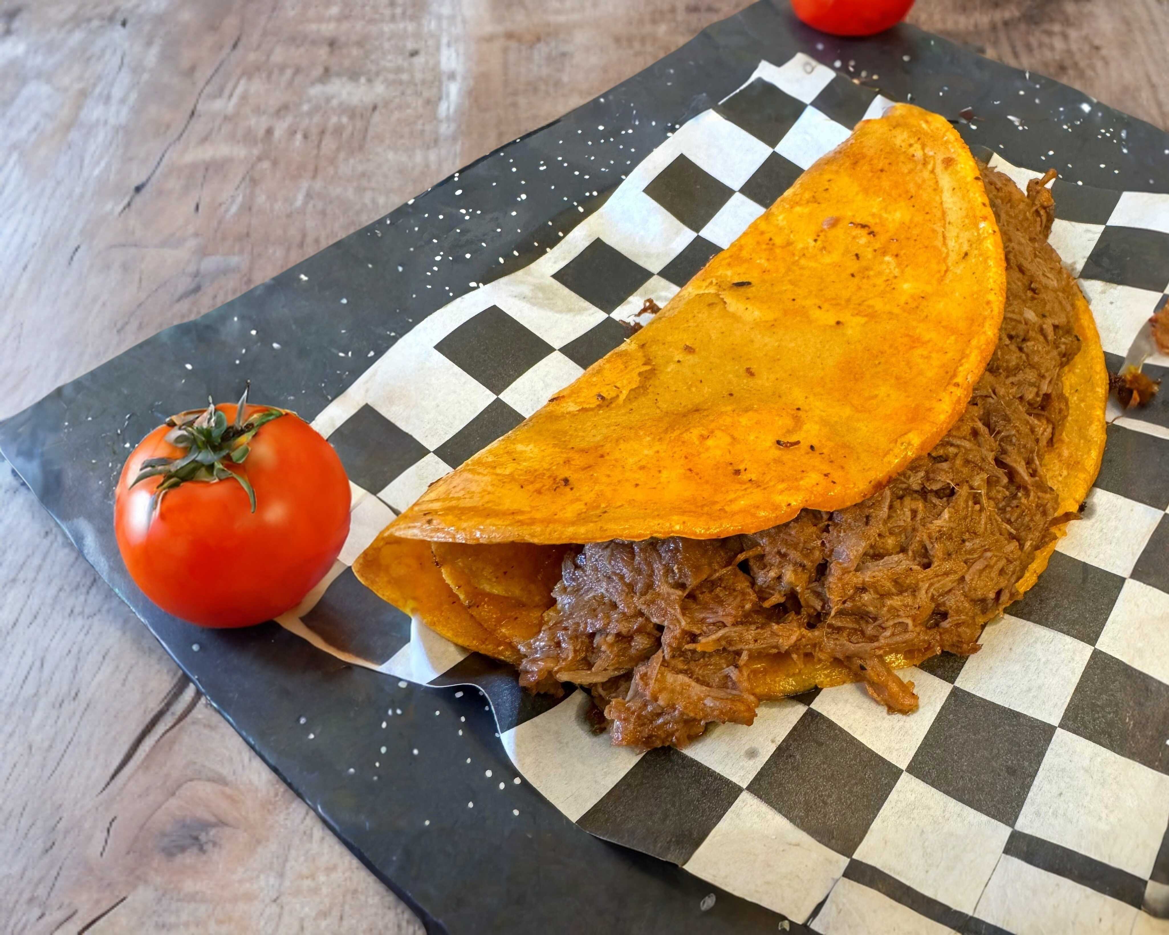 doble tortilla de maíz Bañada en grasa de la misma birria y bien doradito rellenos de la misma y queso