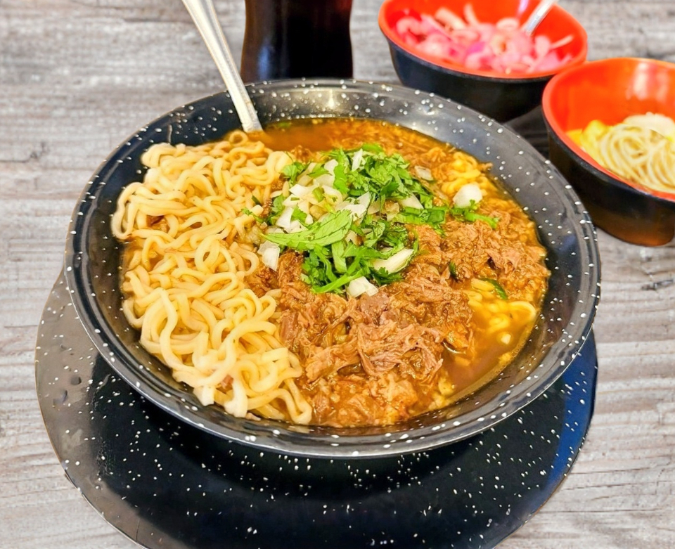 250 gramos de birria acompañado de consomé, complementos y tortillas
