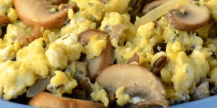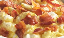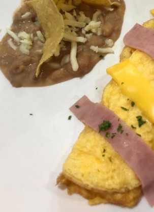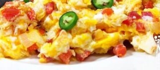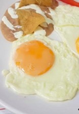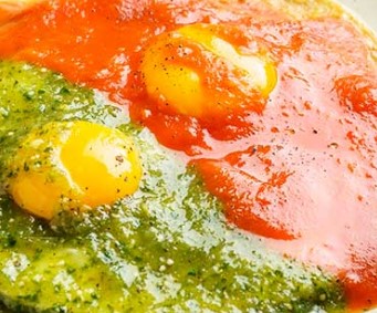 Totopos en salsa verde o roja al gusto, acompañados con frijoles, queso, crema y dos huevos revueltos o estrellados.