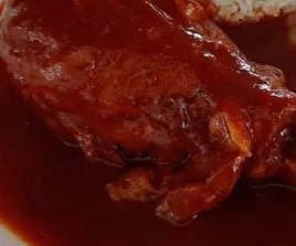 pechuga de pollo desmenuzada bañada de mole, acompañada con arroz y frijoles