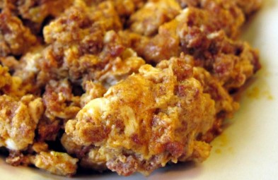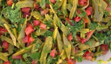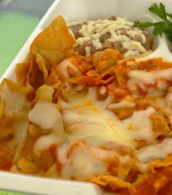 Totopos en salsa verde o roja al gusto, acompañados con frijoles, queso, crema y chorizo.