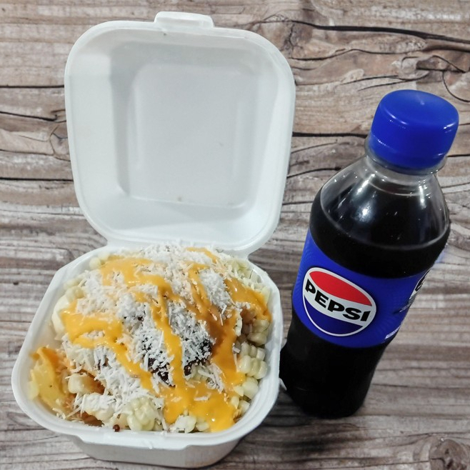 Elote,sabritas,chile en polvio,queso amarillo,crema o mayonesa,queso rallado,pepsi