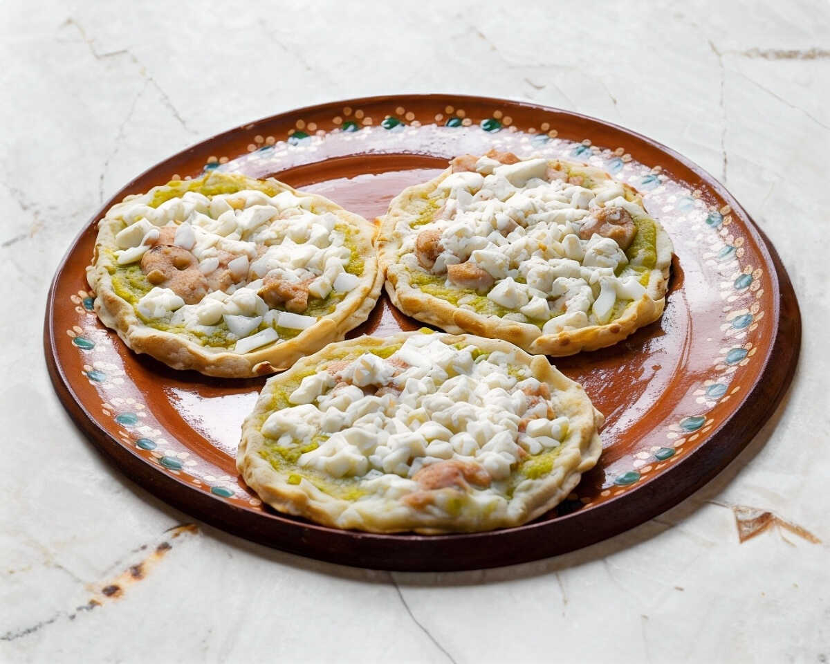 Base de maíz, frijoles, crema, queso, cebolla y cilantro.
