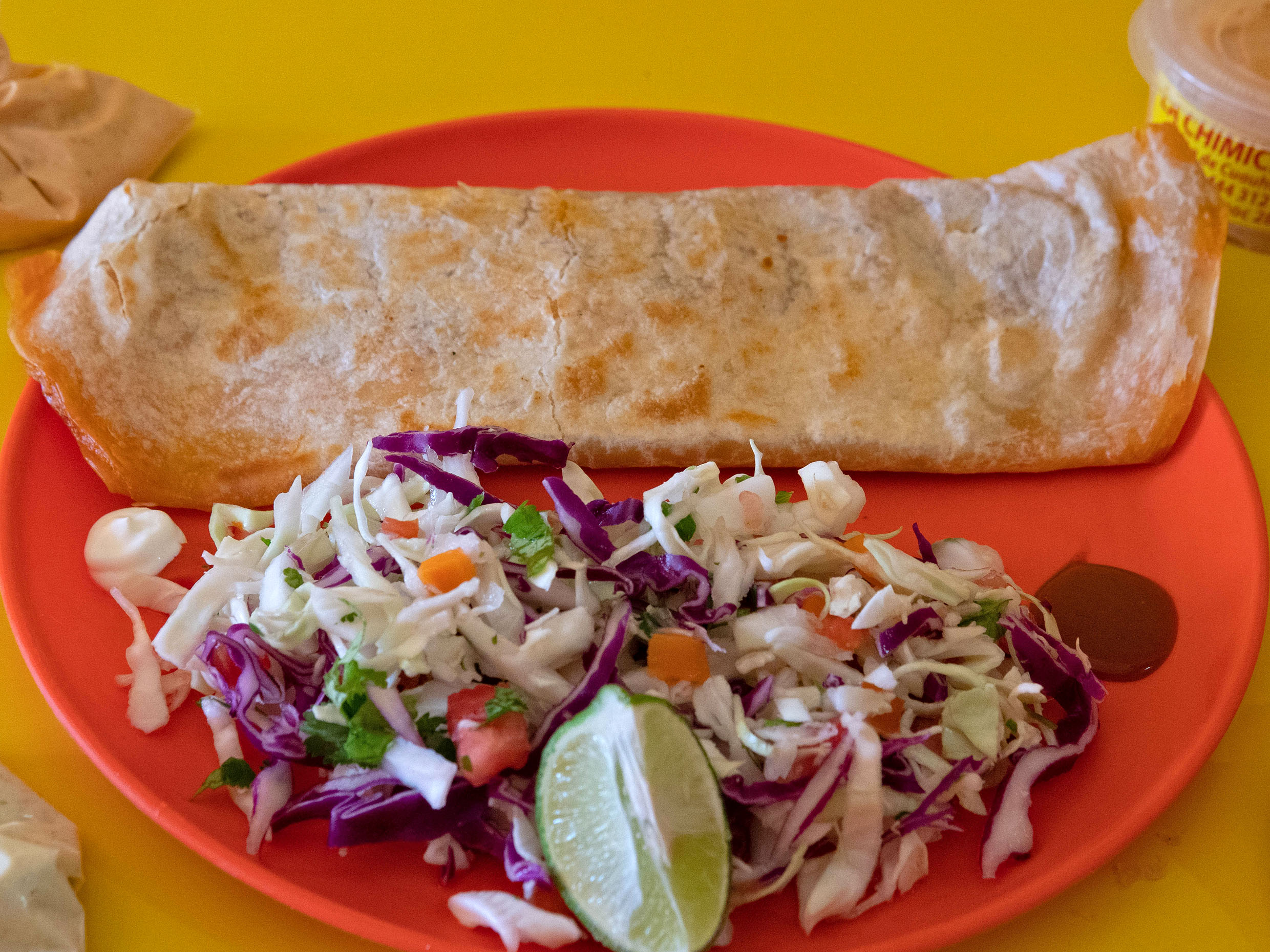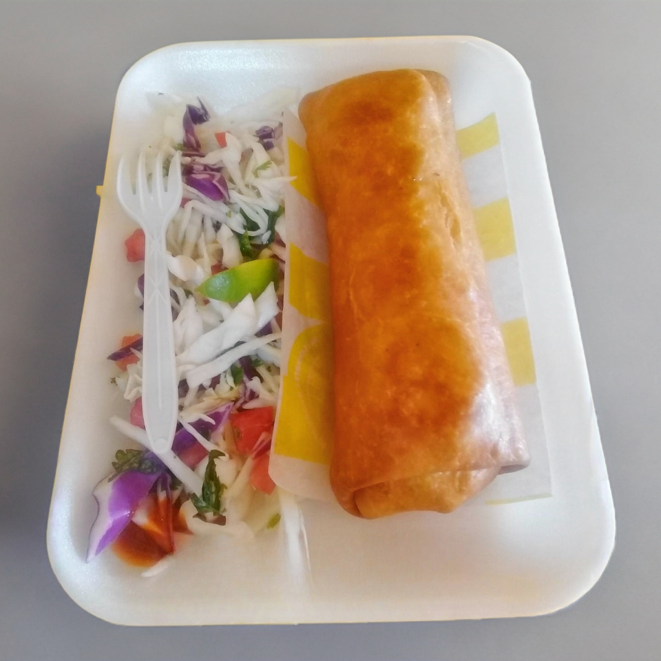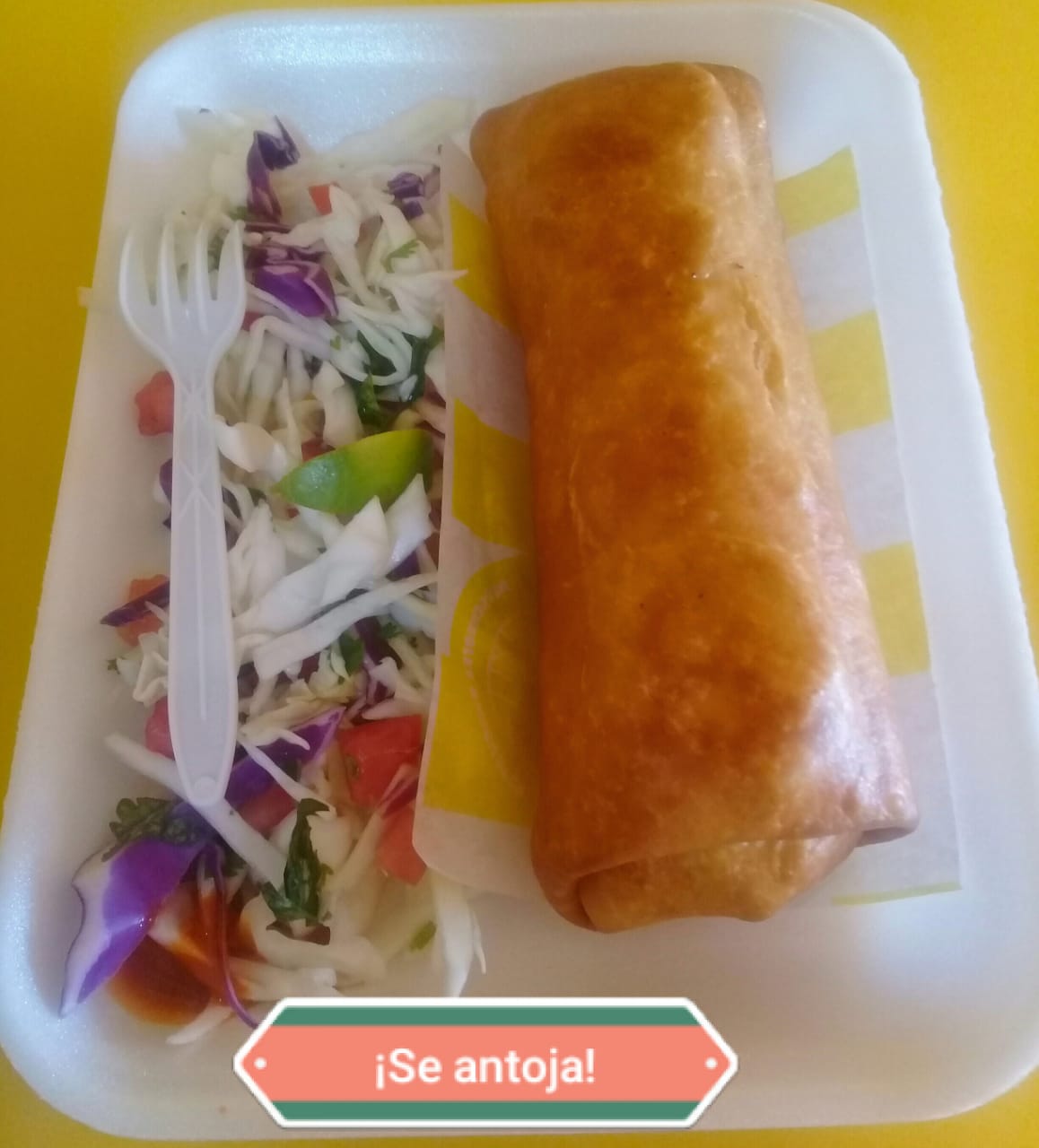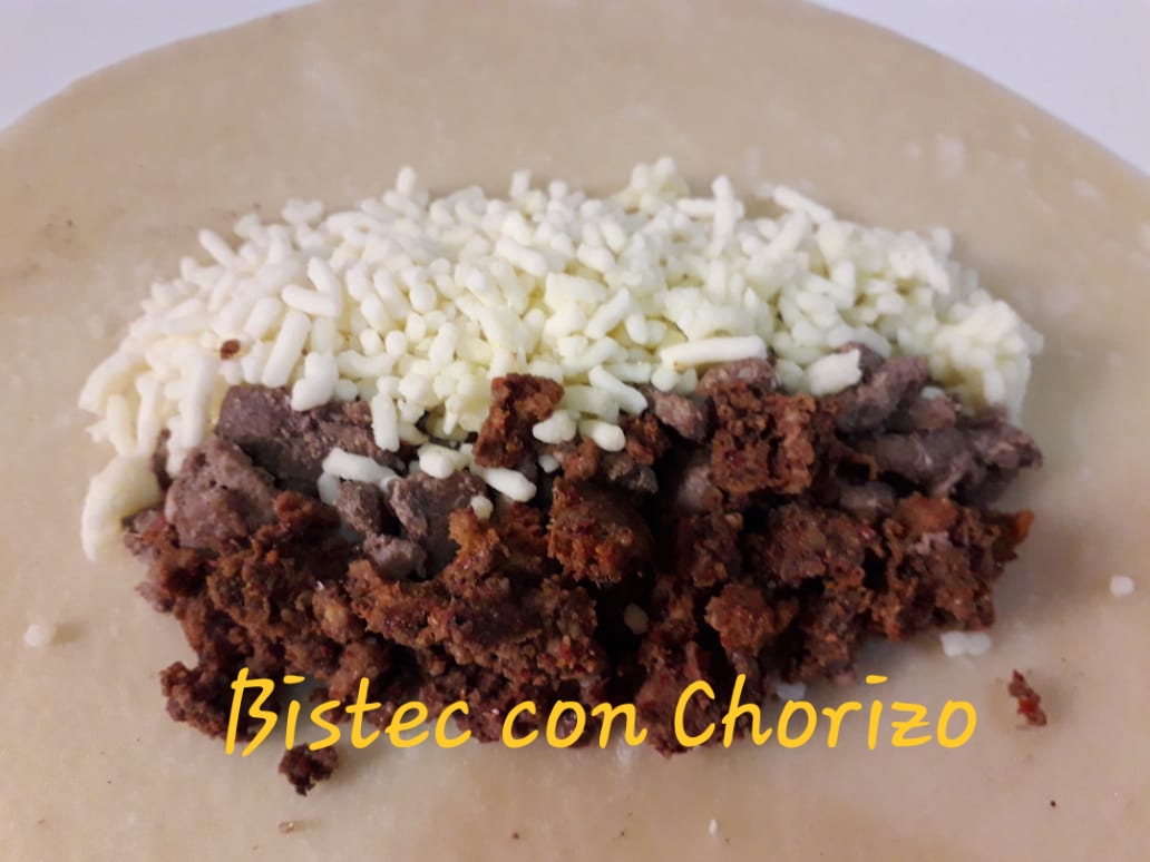 Bistec, chorizo, acompañado de queso asadero, envuelto en tortilla de harina y dorado en manteca vegetal.