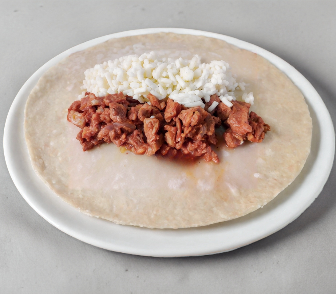 Arrachera en tortilla de harina de 25 cm al comal, mezclada con queso asadero.