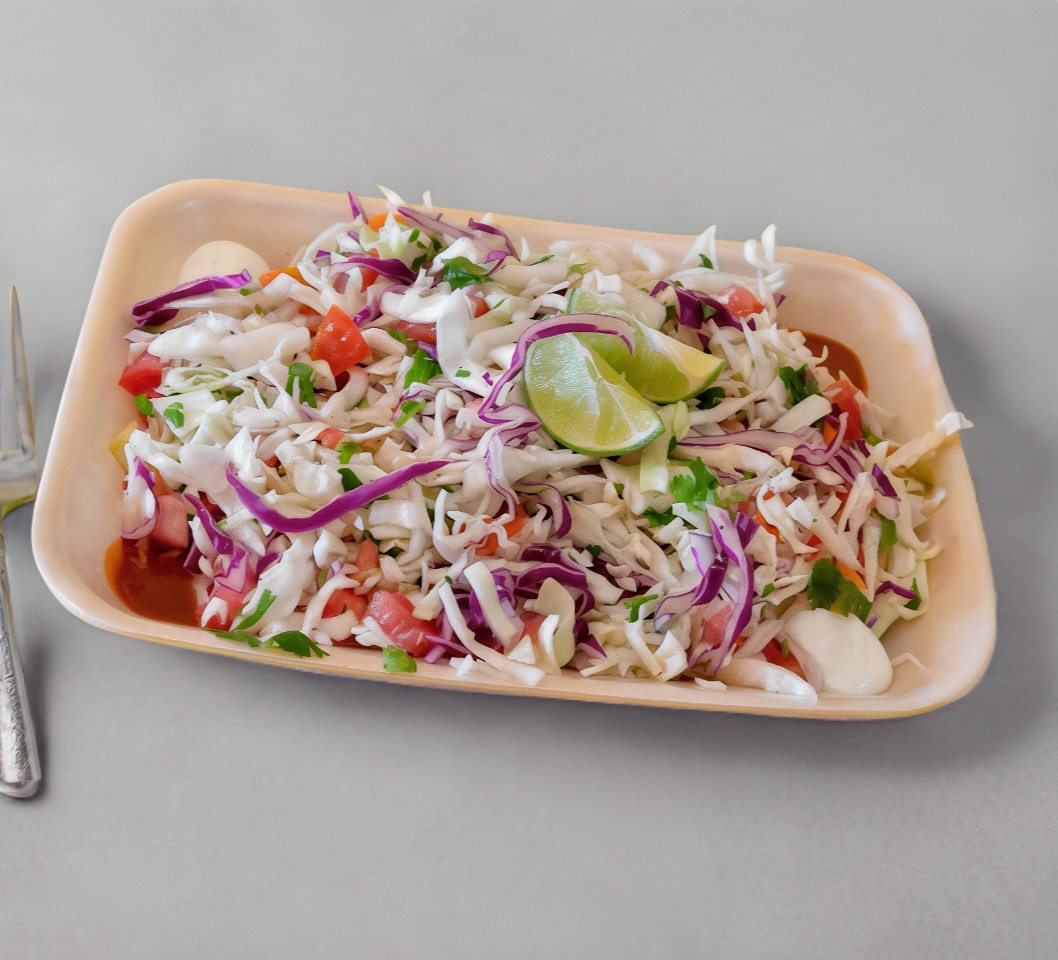 2 porciones juntas para acompañar tu chimichanga, repollo verde, repollo morado, jitomate, cilantro, salsa roja, crema y un toque de zanahoria.