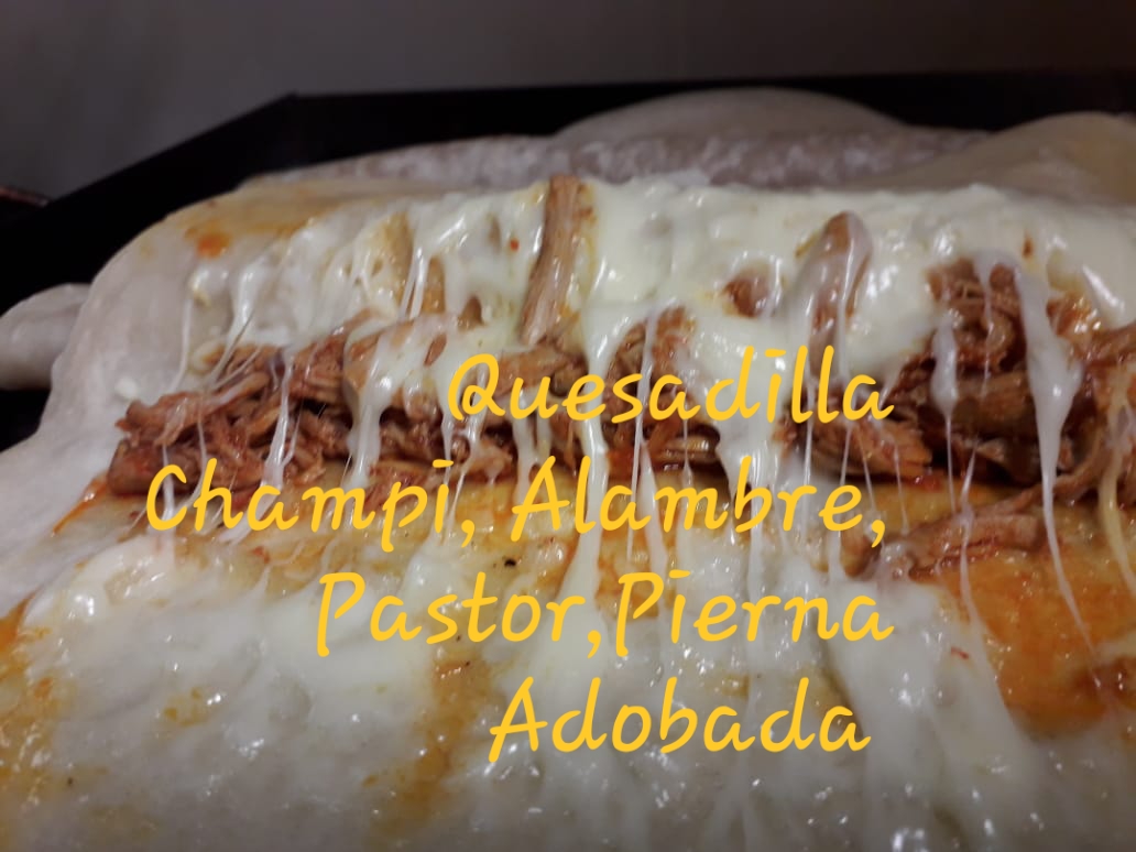 Carne de Cerdo Marinada y un toque de cebollita frita en tortilla de harina de 25 cm al comal más queso asadero.