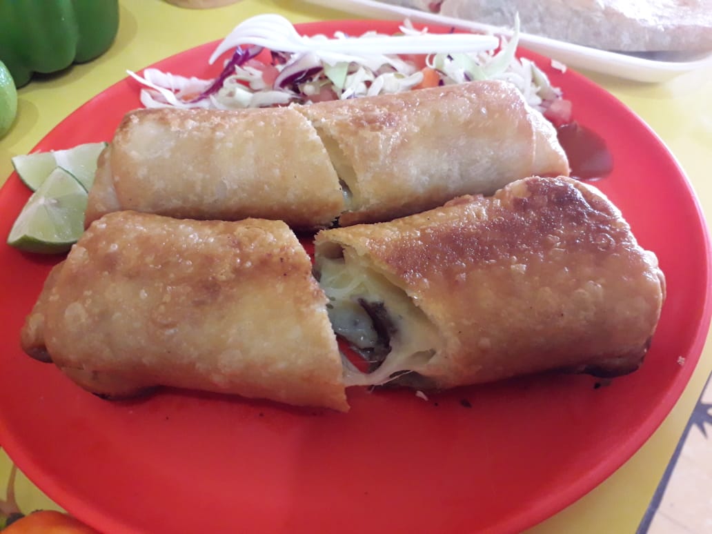 Bistec de cerdo marinado por la casa, con un toque de cebolla frita, acompañado de queso asadero, envuelto en tortilla de harina y dorado en manteca vegetal.