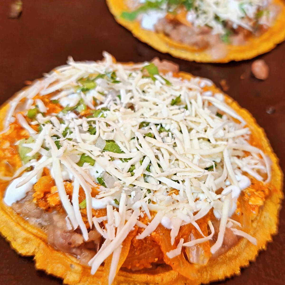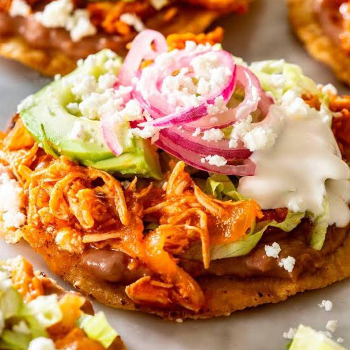 Base de 2 tostadas con frijoles y el guisado de tu elección coronado con lechuga, queso fresco, crema, jitomate, cebolla y aguacate.