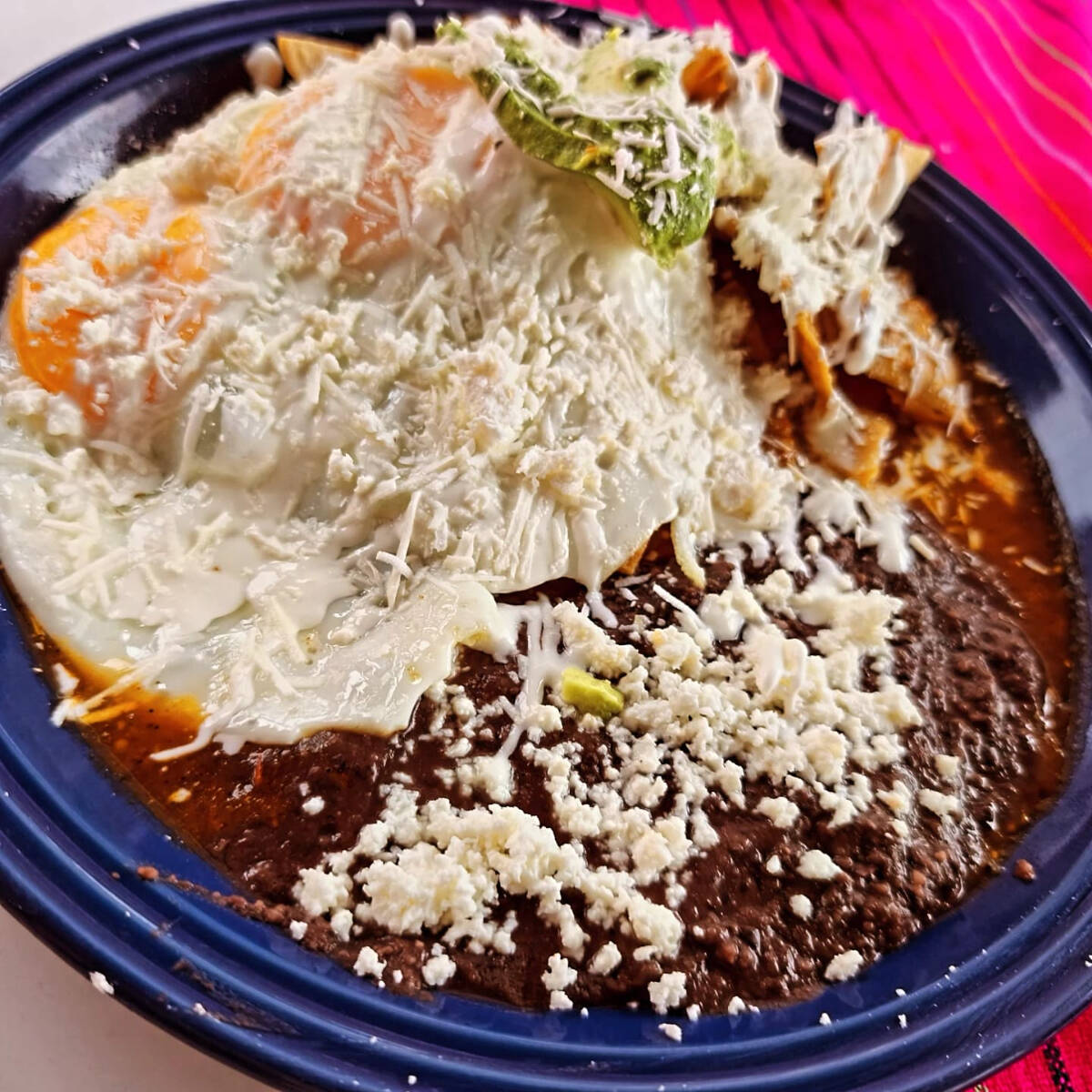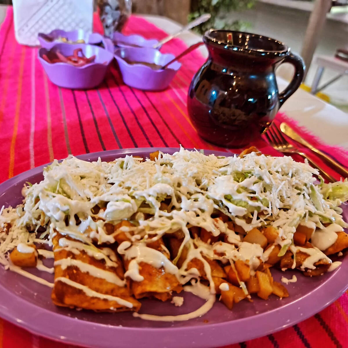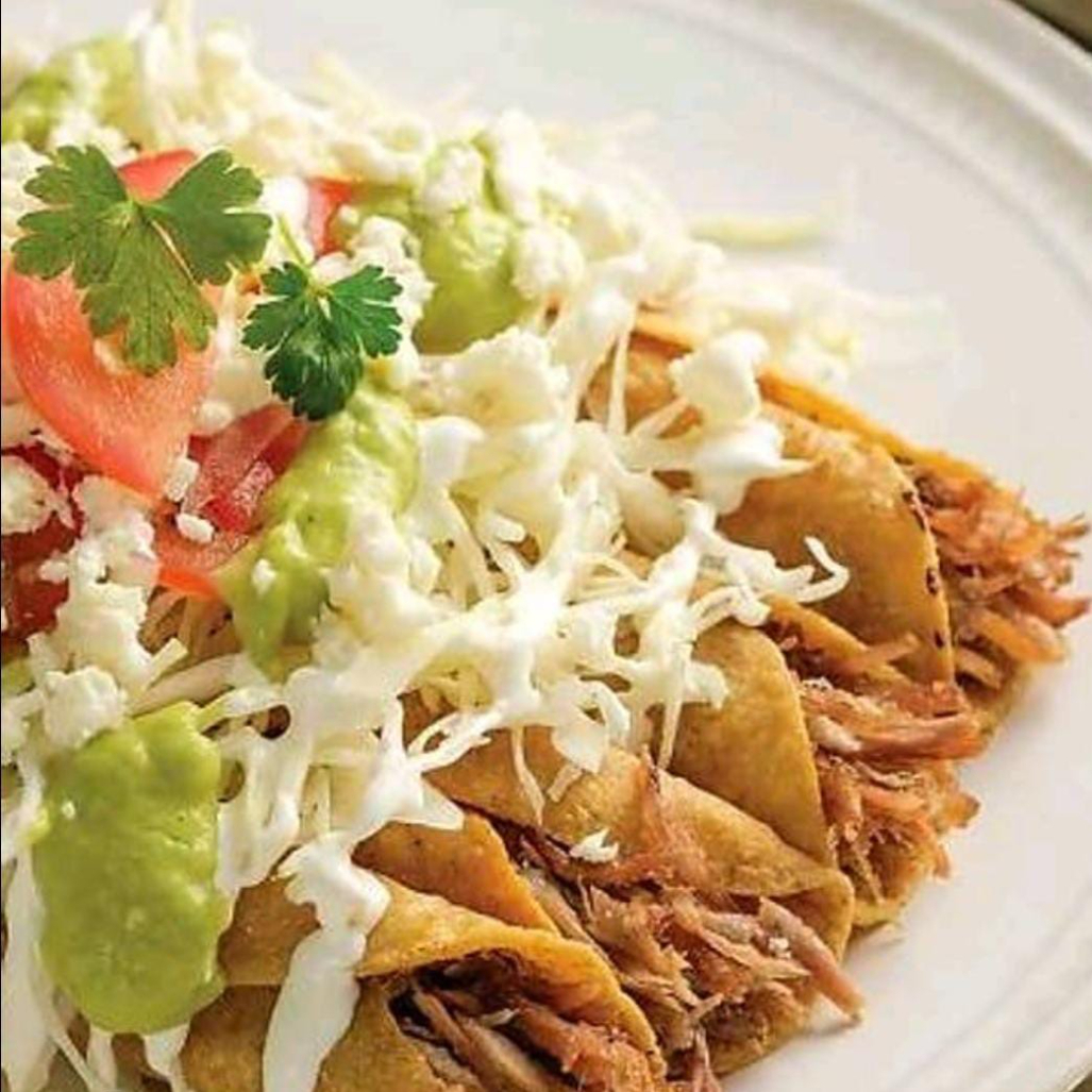 Totopo crujiente bañados en nuestra deliciosa salsa cremosa, coronado con crema, queso fresco, aguacate y cebolla, acompañado de frijoles refritos.
