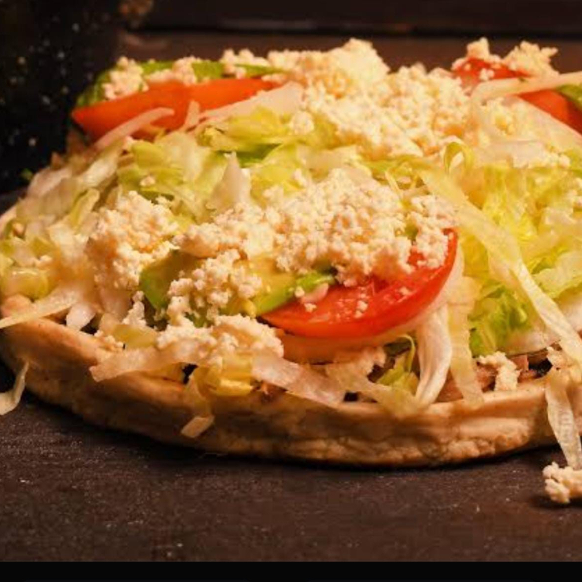 Migada de maíz coronado con frijoles refritos, el guisado de tu preferencia, Lechuga, jitomate, cebolla, queso y crema.