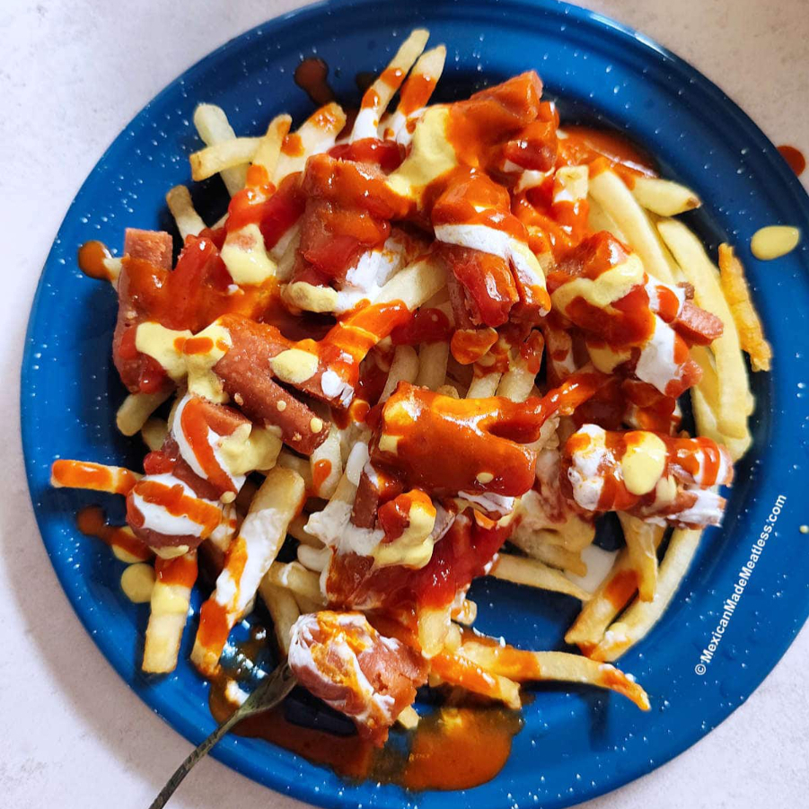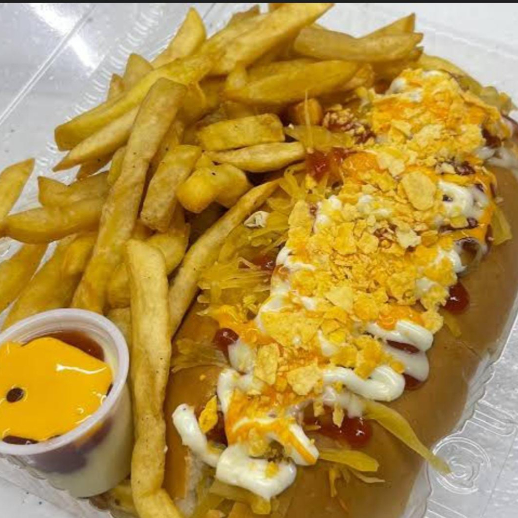 Hot dog estilo chicago, con queso gratinado, cebolla caramelizada, tocino picado y pico de gallo acompañado de papas a la Francesa.