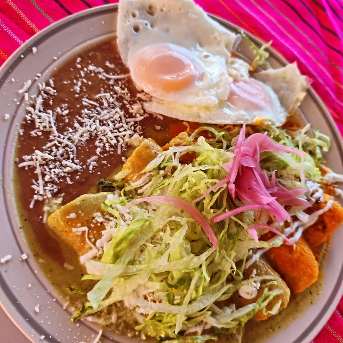 4 tortillas hechas a rellenas de queso fresco y bañadas en la salsa de tu preferencia
