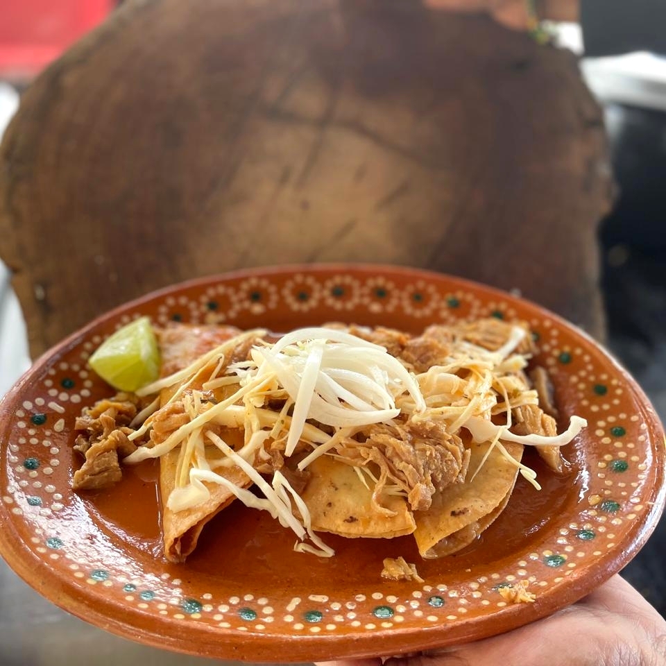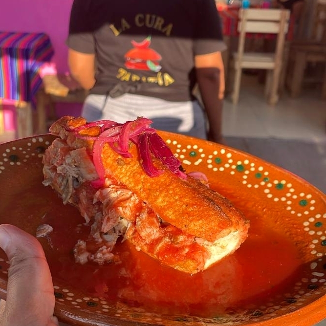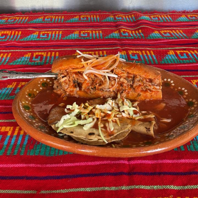 Birote salado con carnitas bañado en una salsa de jitomate y cebolla encurtida