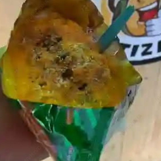 Elote entero cortado en trozos y revuelto en una bolsa estilo río verde, crema, mayonesa, chile, limón y queso blanco.