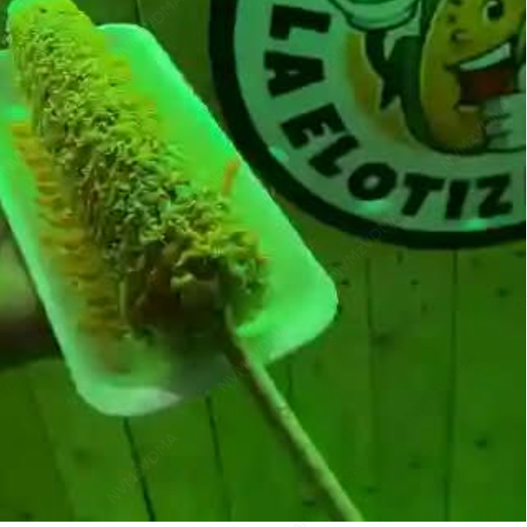 Elote entero con mayonesa, crema, chile, limón, salsa macha, empanizado con Cheetos Flamin' Hot o Doritos, queso blanco y amarillo.