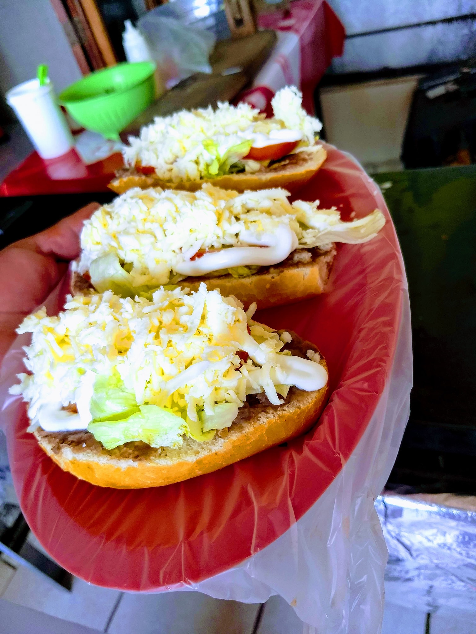 Ricos molletes con frijoles, lechuga, jitomate, cebolla, crema y queso.