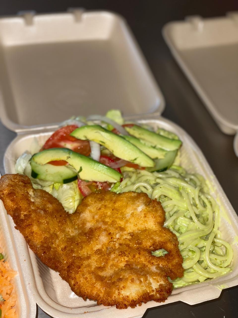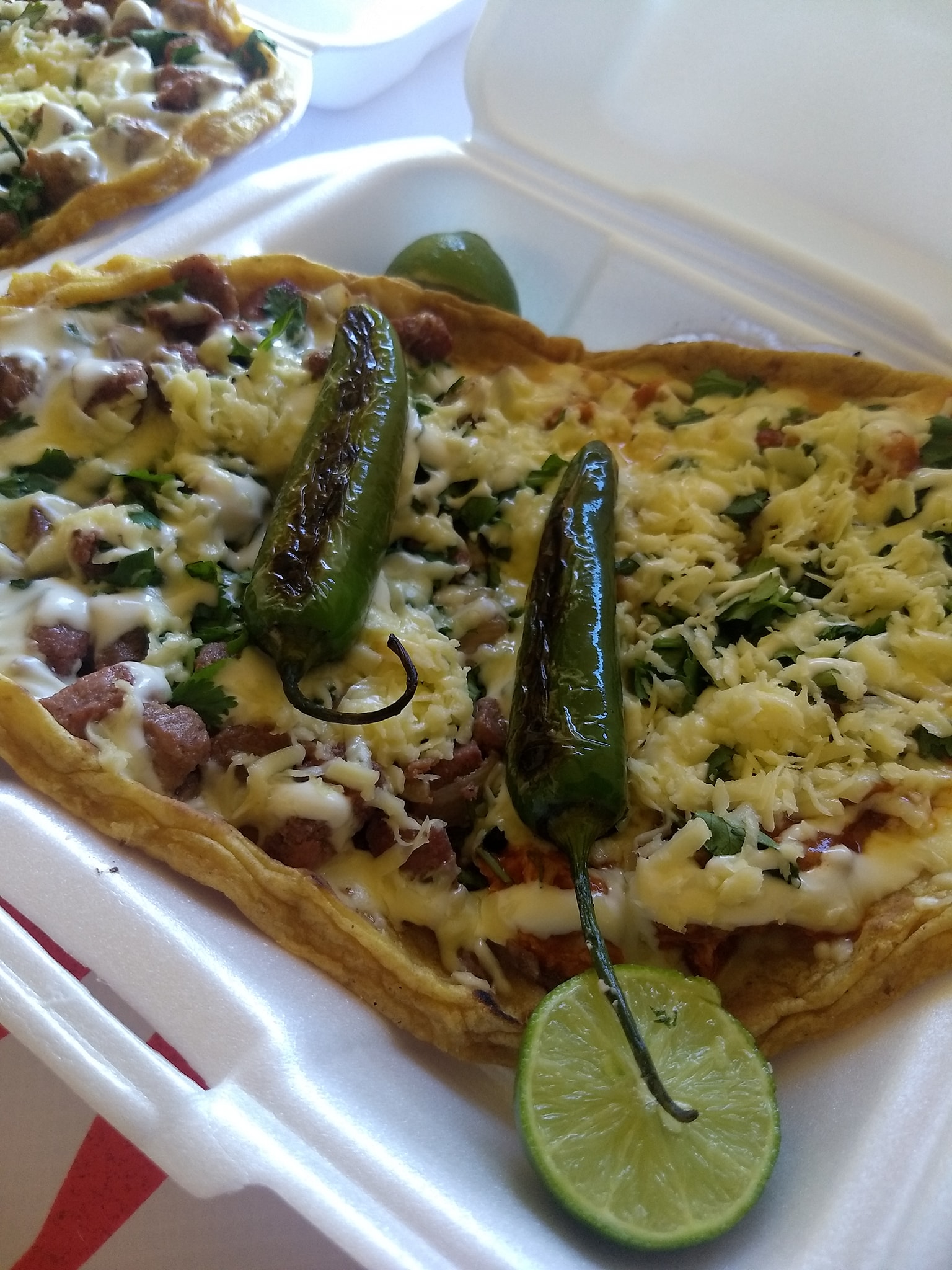 Huarache de aproximadamente 30 cm con el guisado a tu elección, cilantro, cebolla, crema y queso.