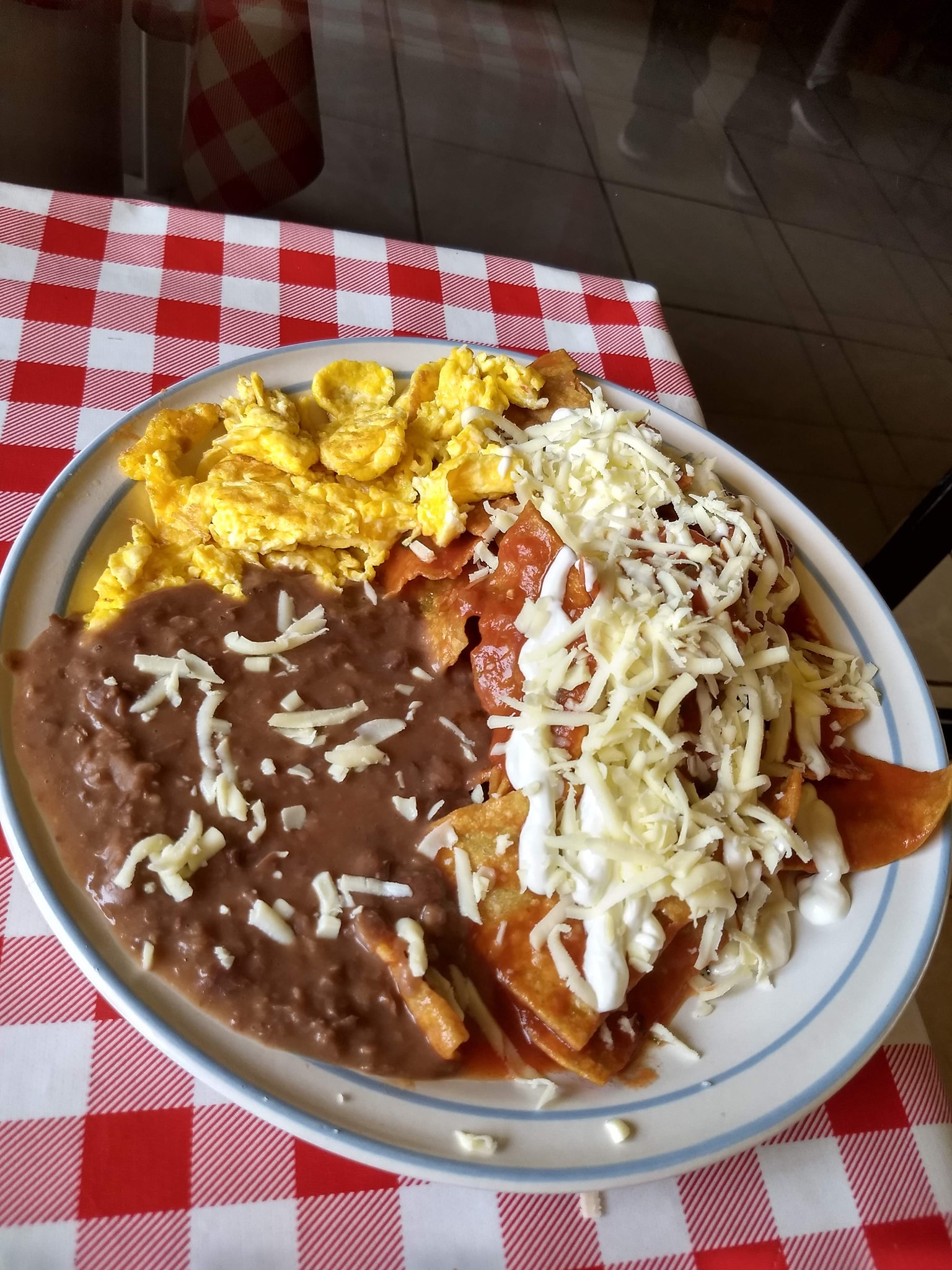 ricos chilaquiles con huevo al gusto, frijoles refritos, pieza de bolillo y cafe