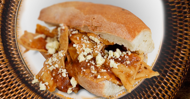 Rica torta de chilaquiles con una base de frijoles, chilaquiles, crema y queso.