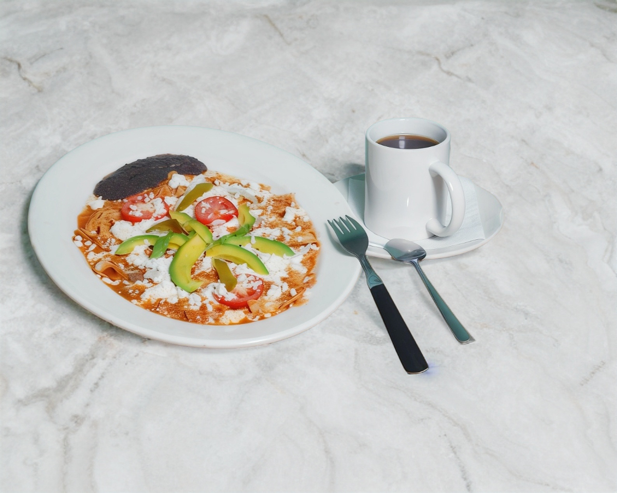 Chilaquiles, 1 jugo de naranja 355ml, 1 café 355ml, 1 plato de fruta.