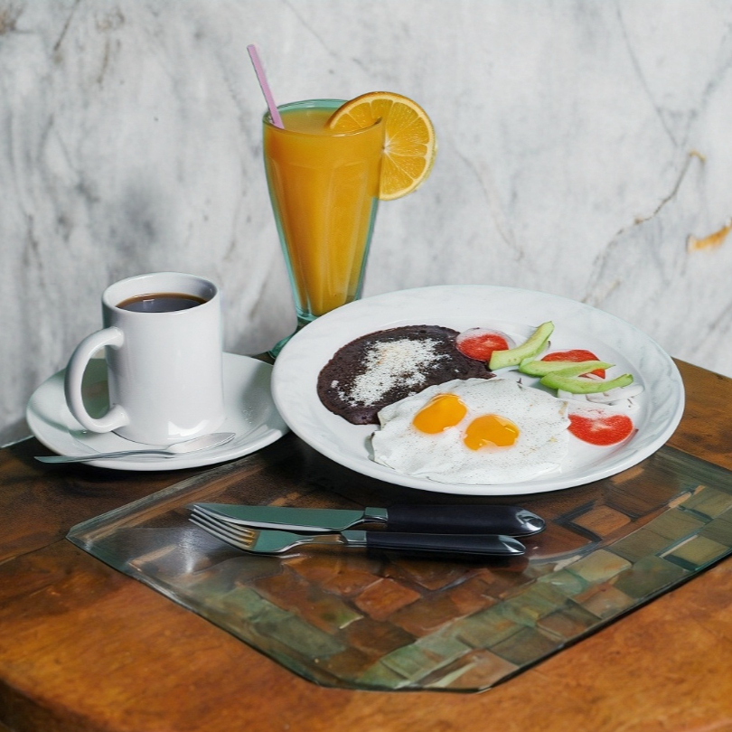 Huevos al gusto, frijoles, 1 jugo de naranja 355ml, 1 café 355ml, 1 plato de fruta.