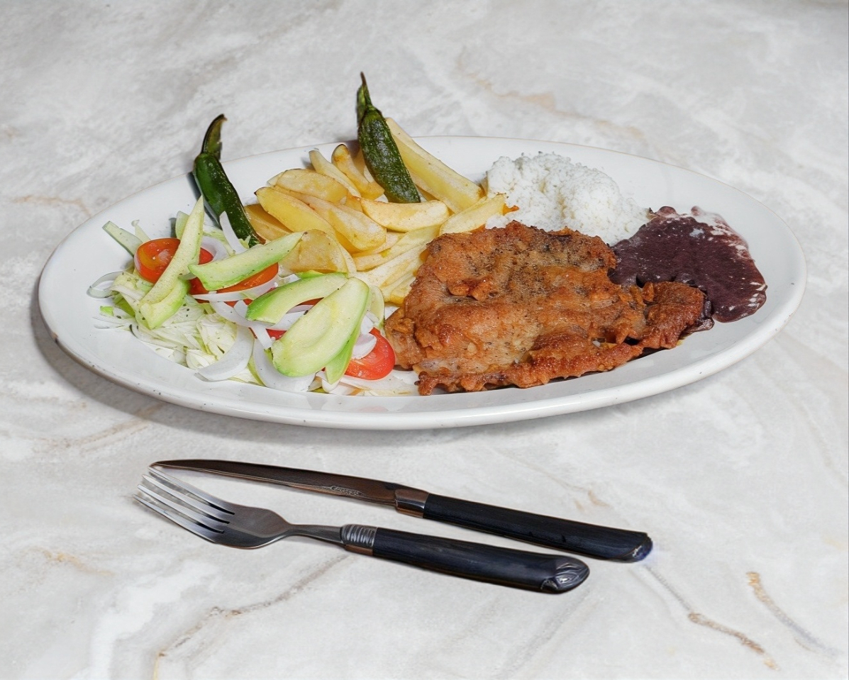 1 Piezas de milanesa de res o pollo, acompañado de papas a la francesa, ensalada, frijoles y tortillas.