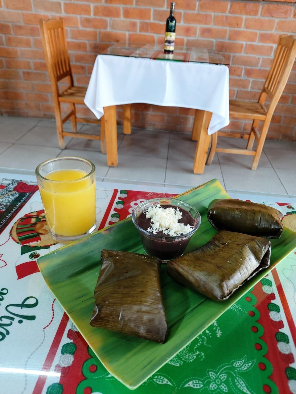 Zacahuil con carne de puerco y pollo, 1 jugo de naranja 355ml, 1 café 355ml, 1 plato de fruta.