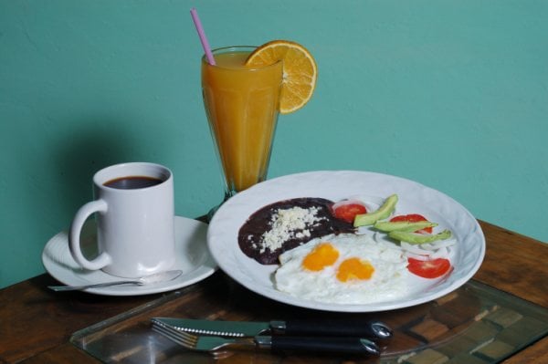 Huevos al gusto con frijoles y tortillas.