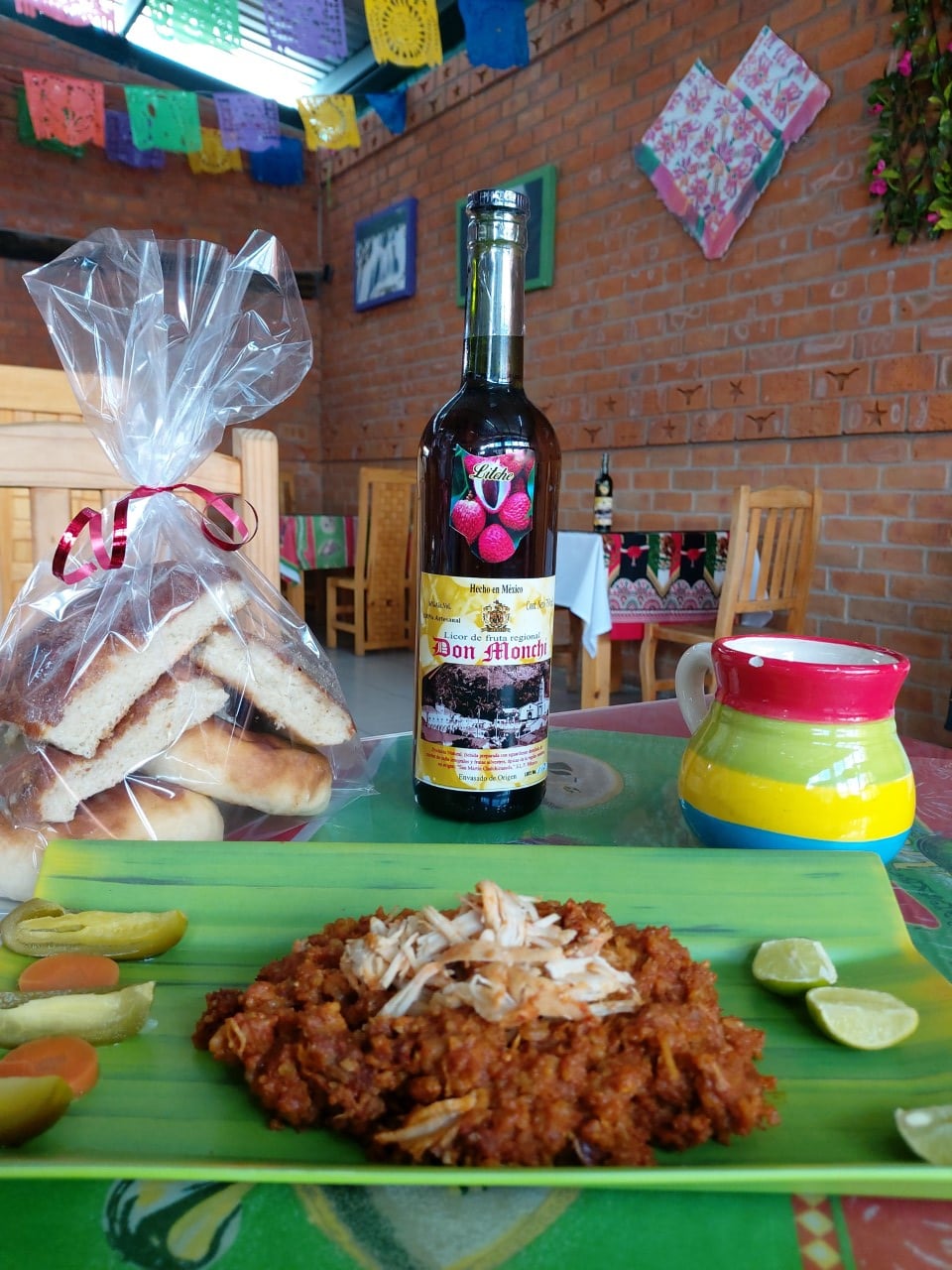 Zacahuil de pollo y puerco, chiles en vinagre y limones.