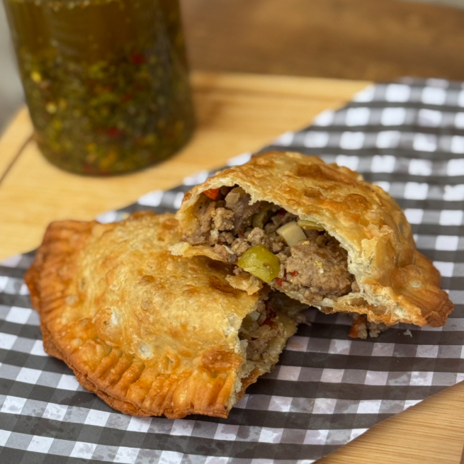 Deliciosa empanada GIGANTE rellena de guisado de carne con aceituna, pimiento rojo, huevo, cebolla y especias.