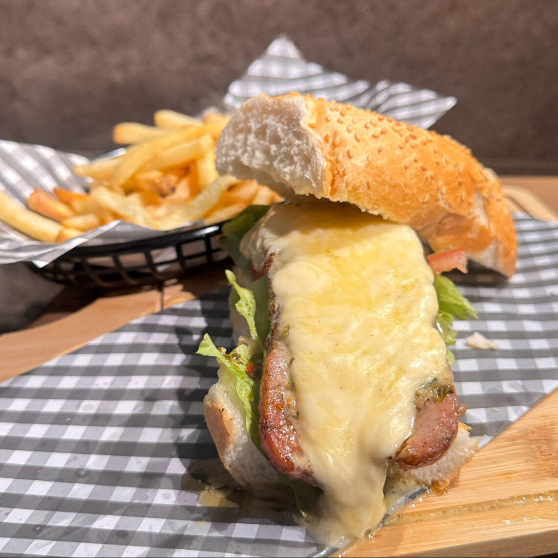 Baguette de jugoso y original chorizo argentino bañado de queso, acompañado de cama de lechuga, tomate y nuestro delicioso chimichurri original argentino.